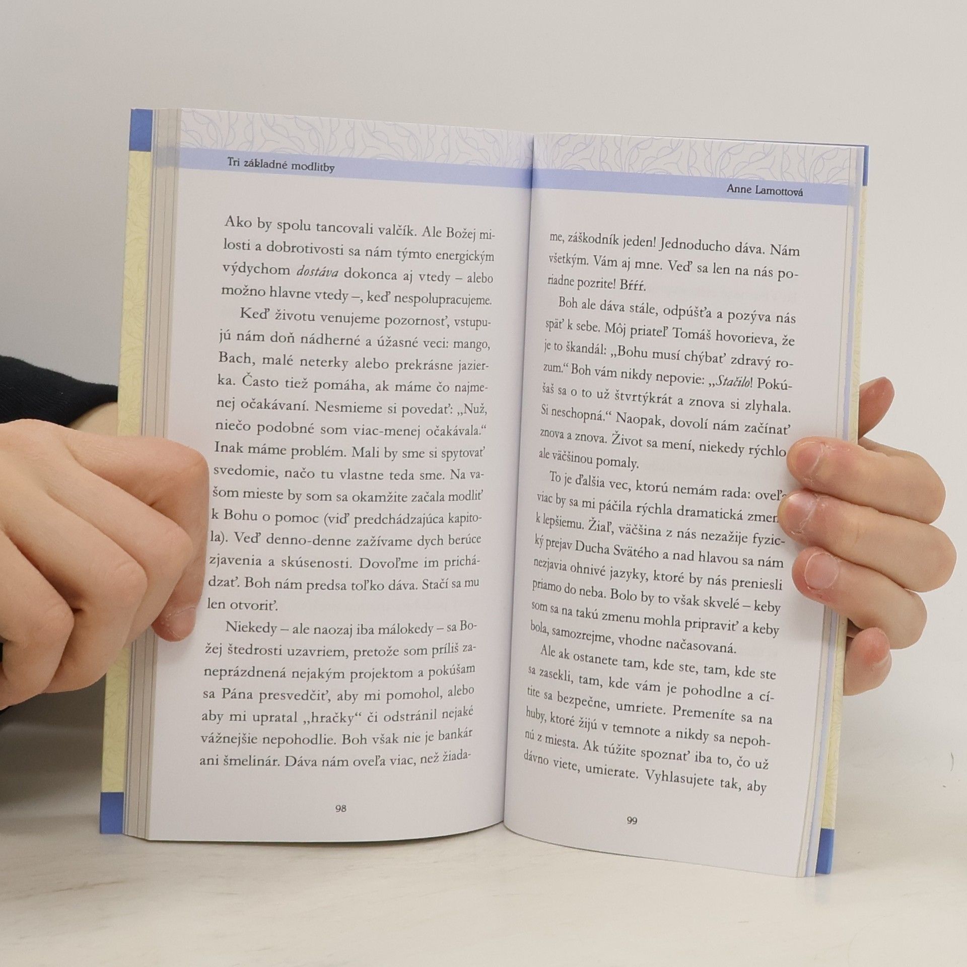 KNIŽKA O TROCH ZÁKLADNÝCH MODLITBÁCH, ktoré vám pomôžu prekonať ťažké chvíle, vyriešiť každodenné problémy a žiť svoj život v plnosti Knihy Anne Lamottovej oslovujú čitateľov každého veku, pretože v nich o svojej viere a modlitbe rozpráva s neuveriteľnou nehou a vtipom. Autorka vám ponúka všetko, čo sa o modlení naučila a tieto poznatky zhrnula do troch pravdivých príbehov. Tri základné modlitby – prosba o pomoc, poďakovanie a schopnosť vážiť si svet okolo seba – dokážu pomôcť v akejkoľvek ťažkosti a umožnia vám prekonať ju. Autorka knihu pretkáva rozprávaním o tom, ako sa začala modliť, čo pre ňu tieto tri modlitby znamenajú, akým spôsobom jej v živote pomohli a ako ich postupne prijali aj jej blízki. Kniha Pane, pomôž mi je inteligentná a úprimná ako každá Lamottovej kniha. Verím, že si ju zamilujú všetci, ktorí sa s Anne Lamottovou stretli prvýkrát a poteší aj jej dlhoročných fanúšikov. ANNA LAMOTTOVÁ patrí medzi hŕstku spisovateliek, ktoré New York Times opakovane označuje za autorky bestsellerov. Žije v Severnej Karolíne a za tvorbu a kreatívny prínos jej bol nedávno udelený Guggenheimov grant. Sledovať ju môžete aj na jej stránkach: facebook.com/AnneLamott alebo twitter.com/AnneLamott 'O modlení toho veľa neviem, ale myslím si, že je veľmi dôležité pripomínať ľuďom, aby sa modlili čo najjednoduchšie, od srdca. Pane, pomôž mi. Pane, ďakujem. Pane, si úžasný. Anne Lamottová'