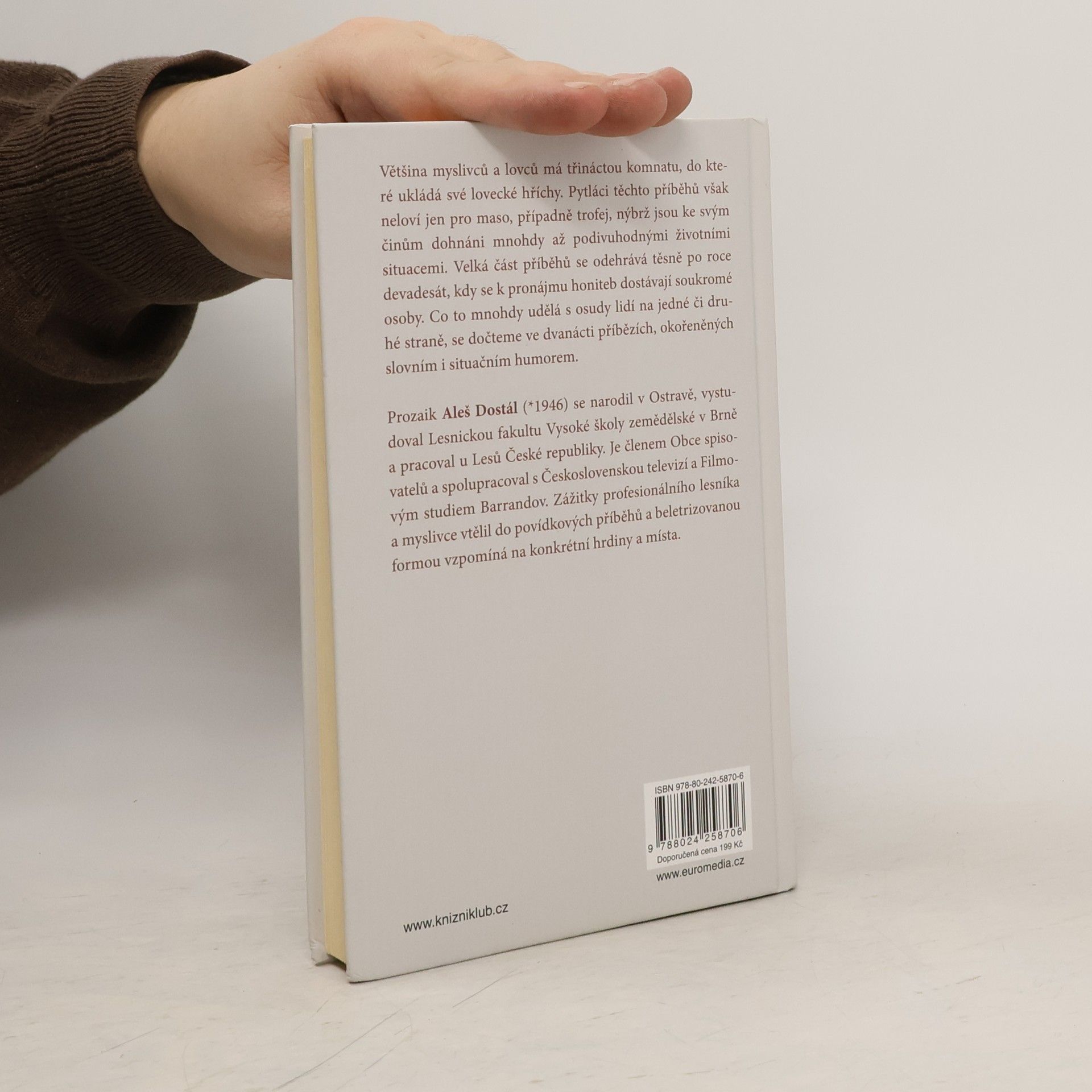 Prozaik Aleš Dostál (*1946) se narodil v Ostravě, vystudoval Lesnickou fakultu Vysoké školy zemědělské v Brně a pracoval u Lesů České republiky. Je členem Obce spisovatelů a spolupracoval s Československou televizí a Filmovým studiem Barrandov. Zážitky z role profesionálního lesníka a myslivce vtělil do povídkových příběhů, které jsou spjaty s konkrétními hrdiny a krajinou. Jeho nejnovější kniha se věnuje fenoménu pytláctví. Většina myslivců a lovců má třináctou komnatu, do které ukládá své lovecké hříchy. Pytláci těchto příběhů však neloví jen pro maso, případně trofej, nýbrž jsou ke svým činům dohnáni mnohdy až podivuhodnými životními situacemi. Velká část příběhů se odehrává těsně po roce devadesát, kdy se k pronájmu honiteb dostávají soukromé osoby. Co to mnohdy udělá s osudy lidí na jedné či druhé straně, se dočteme ve dvanácti příbězích, okořeněných slovním i situačním humorem.