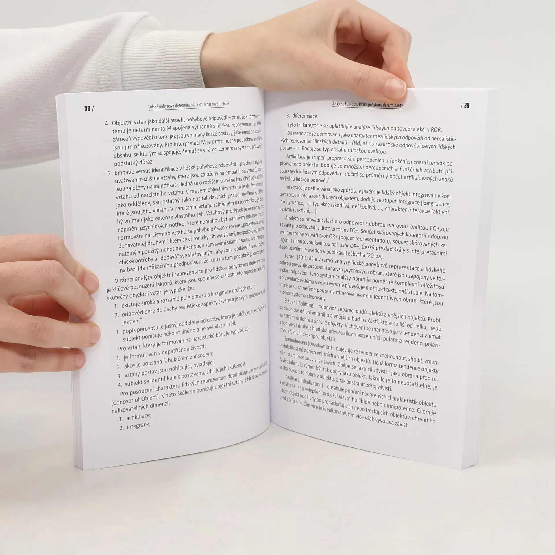 Kniha je určena psychologům a výzkumníkům pracujícím s projektivní metodou. Záměrem je představit možnosti diagnostiky interpersonální adaptace a sebepercepce. Hlavní část je věnována studii, jejímž východiskem jsou zkušenosti autorů publikace s Rorschachovou metodou i dosavadní významné přístupy ke skórování a interpretaci lidské pohybové determinanty v dílech H. Rorschacha, E. Bohma, Z. Piotrowského a dalších. Prezentovány jsou interpretační možnosti determinanty pro různé klinické skupiny, alexithymii, predikci úspěšné adaptace a manažerské výkonnosti. V samotné studii byly ověřeny souvislosti determinanty a 33 kvalitativních kategorií ve vztahu k výsledkům dalších diagnostických metod. Publikace přináší inspiraci i praktické výstupy do psychologického výzkumu a diagnostické praxe.