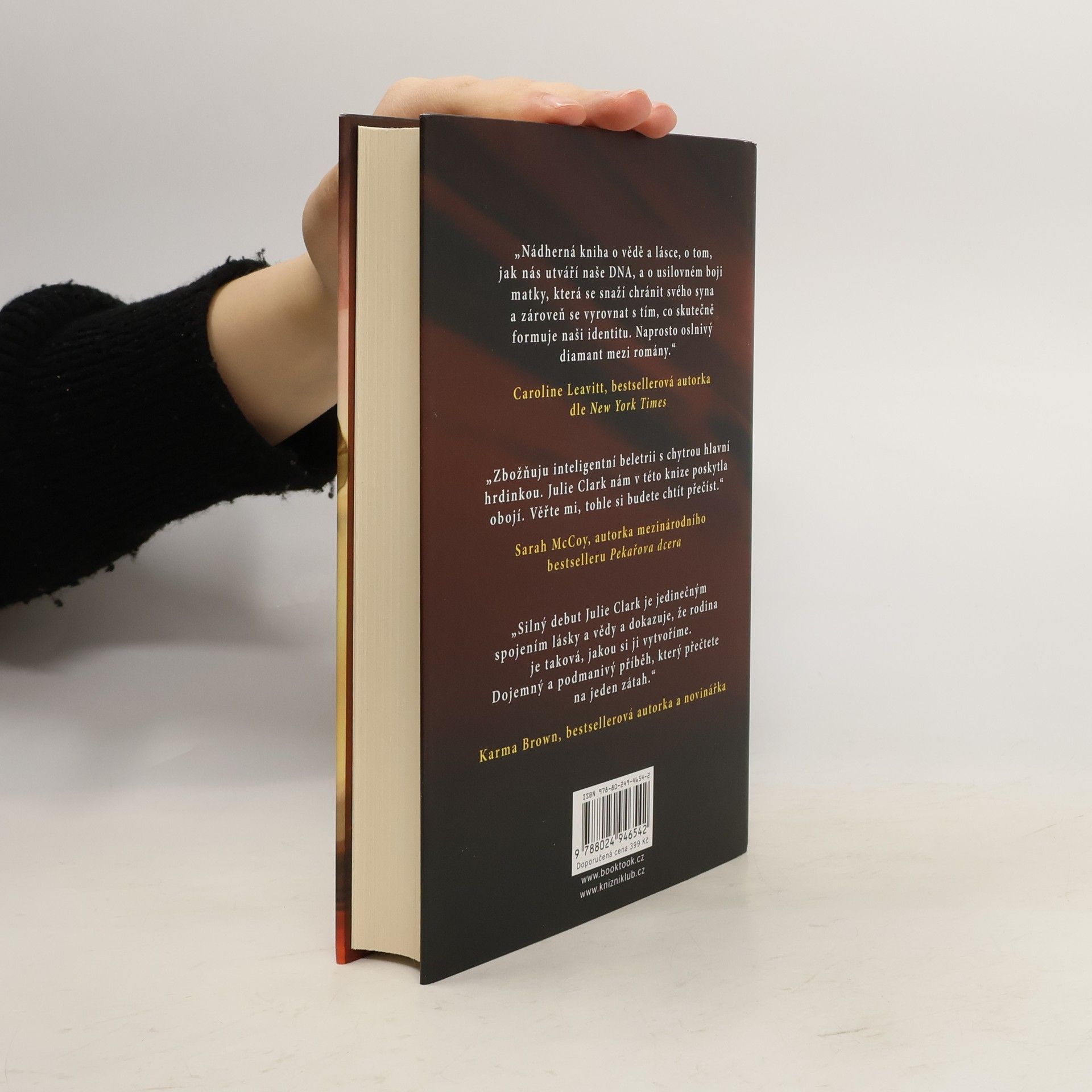 Svět genetičky Paige Robsonové se otřásá v základech: její osmiletý syn Miles se snaží zapadnout v nové škole a začíná se ptát na svého biologického otce. Paigein pečlivě budovaný život se pomalu hroutí, protože pravda o Milesově otci by mohla zničit vše, co pro ni dosud bylo cenné. A když dojde k neštěstí, Paige musí čelit důsledkům sdílení tajemství, které zná jen ona. Autorka New York Times´ bestselleru Poslední let Julie Clark ve své prvotině s lehkostí a vtipem ukazuje, že zatímco věda je fascinující, řešení intimních tajemství, kdo jsme a odkud pocházíme, probouzí emoce složitější než vlákna DNA, jež nás utvářejí.