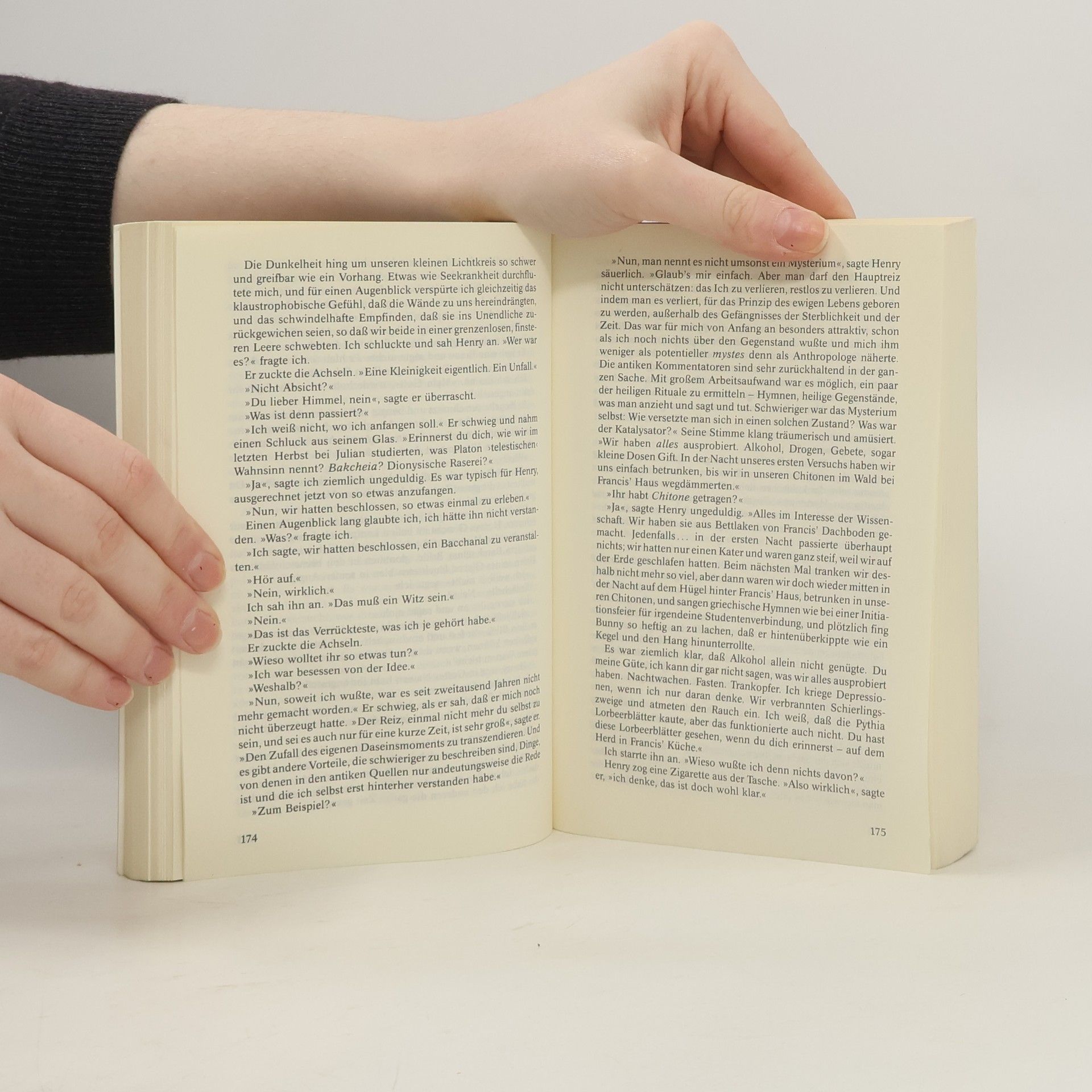 Richard Papen stammt aus einfachen Verhältnissen. In einem kalifornischen Provinznest geboren, träumt er von nichts anderem, als fortzukommen. Endlich gelingt es ihm, ein Stipendium für das College von Hampden in Vermont zu erhalten, und die Welt, der er dort begegnet, zieht ihn vom ersten Augenblick an. Besonders fasziniert ist Richard von einer Gruppe fünf junger Studenten, die sich zusammen mit ihm bei dem verschrobenen Griechischprofessor Julian Morrow eingeschrieben haben. Da ist Henry, der Sohn reicher Eltern und heimliche Kopf des Zirkels, da ist Francis, ein leicht dekadenter und blasierter Gelderbe, das sind Charles und Camilla, die Zwillinge, die seit dem Tod ihrer Eltern von den Zuwendungen ihrer Grossmutter leben., und schliesslich Edmund, von allen „Bunny“ genannt, der liebenswürdige Schnorrer, der stets auf grossem Fusse lebt, ohne je einen Pfennig in der Tasche zu haben. Gemeinsam mit ihnen paukt Richard Griechisch, zusammen mit ihnen huldigt er dem täglichen Alkohol, in ihrem Kreis verbringt er wunderbare Wochenenden auf Francis feudalem Landsitz. Doch bald spürt er, dass unter der Oberfläche unverbrüchlicher Freundschaft auch Spannungen bestehen und dass ein furchtbares Geheimnis auf seinen Freunden lastet - ein Geheimnis, das auch ihn mehr und mehr in seinen dunklen, mörderischen Sog zieht.