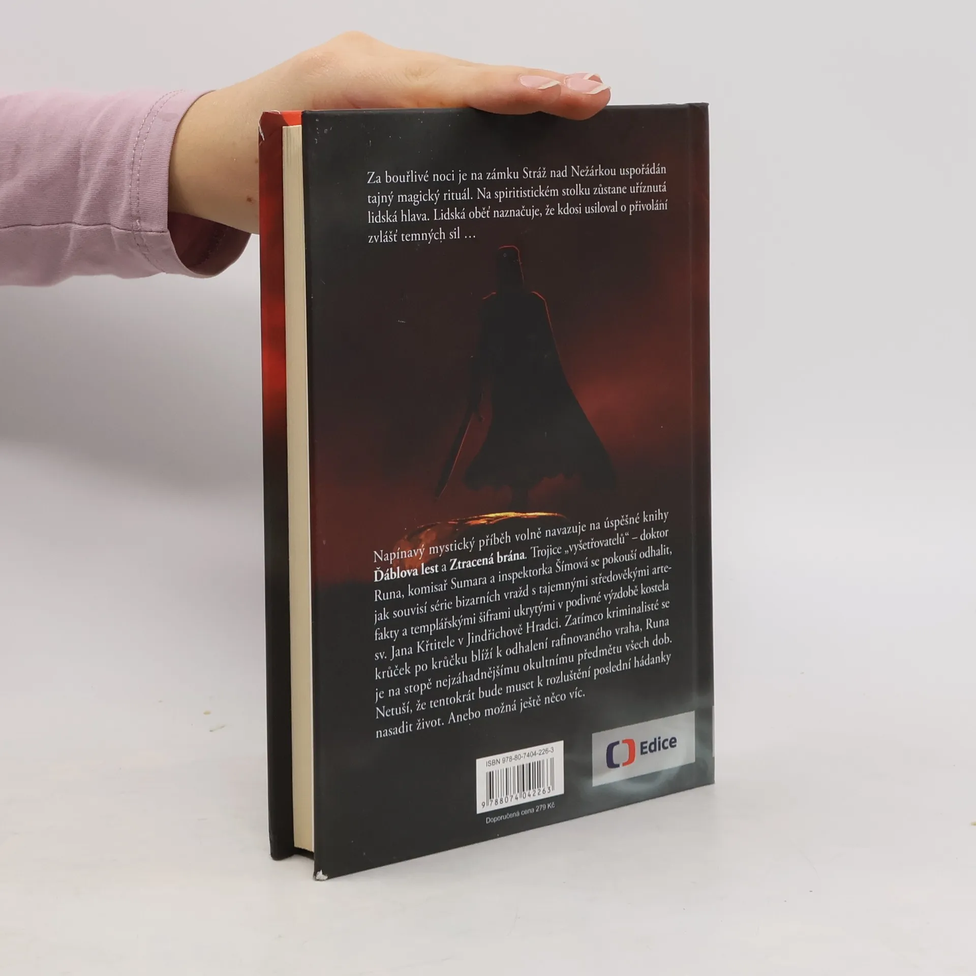 Za bouřlivé noci je na zámku Stráž nad Nežárkou uspořádán tajný magický rituál. Na spiritistickém stolku v Komnatě duchů zůstane uříznutá lidská hlava. Tělo je nalezeno na starém pohanském obětišti v lese. Kromě hlavy mu chybí i pravá ruka. Lidská oběť naznačuje, že kdosi usiloval o přivolání zvlášť temných sil… Napínavý mystický příběh volně navazuje na úspěšné knihy Ďáblova lest a Ztracená brána. Trojice „vyšetřovatelů“ – doktor Runa, komisař Sumara a inspektorka Šímová se pokouší odhalit, jak souvisí série bizarních vražd s tajemnými středověkými artefakty a templářskými šiframi ukrytými v podivné výzdobě kostela sv. Jana Křtitele v Jindřichově Hradci. Zatímco kriminalisté se krůček po krůčku blíží k odhalení rafinovaného vraha, Runa je na stopě nejzáhadnějšímu okultnímu předmětu všech dob. Netuší, že tentokrát bude muset k rozluštění poslední hádanky nasadit život. Anebo možná ještě něco víc.