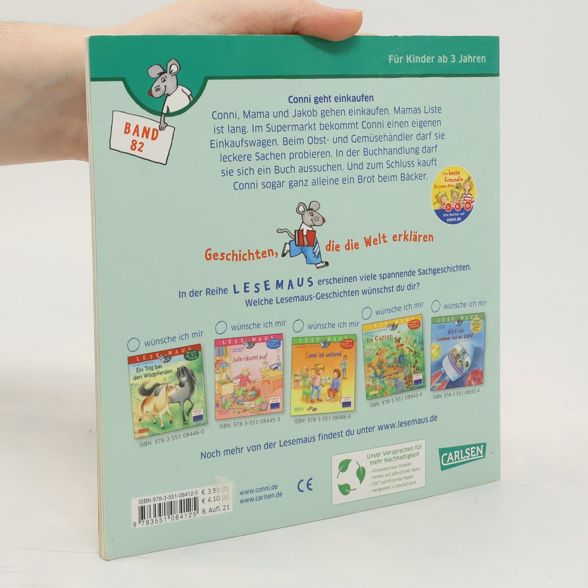 Conni geht mit Mama und Jakob einkaufen. Da gibt es viel zu entdecken. Wie geht das mit dem Einkaufwagen? Wohin bringt man Leergut? Wie und wo wiegt man Obst und Gemüse? Was gibt es in einer Drogerie? In der Buchhandlung gibt es neue Bücher für Conni und Jakob. Und später geht Conni sogar alleine zum Bäcker. - Einkaufen in Buchhandlung, Drogerie, Bäckerei und Supermarkt - erklärt Einzelhandel und Familienalltag