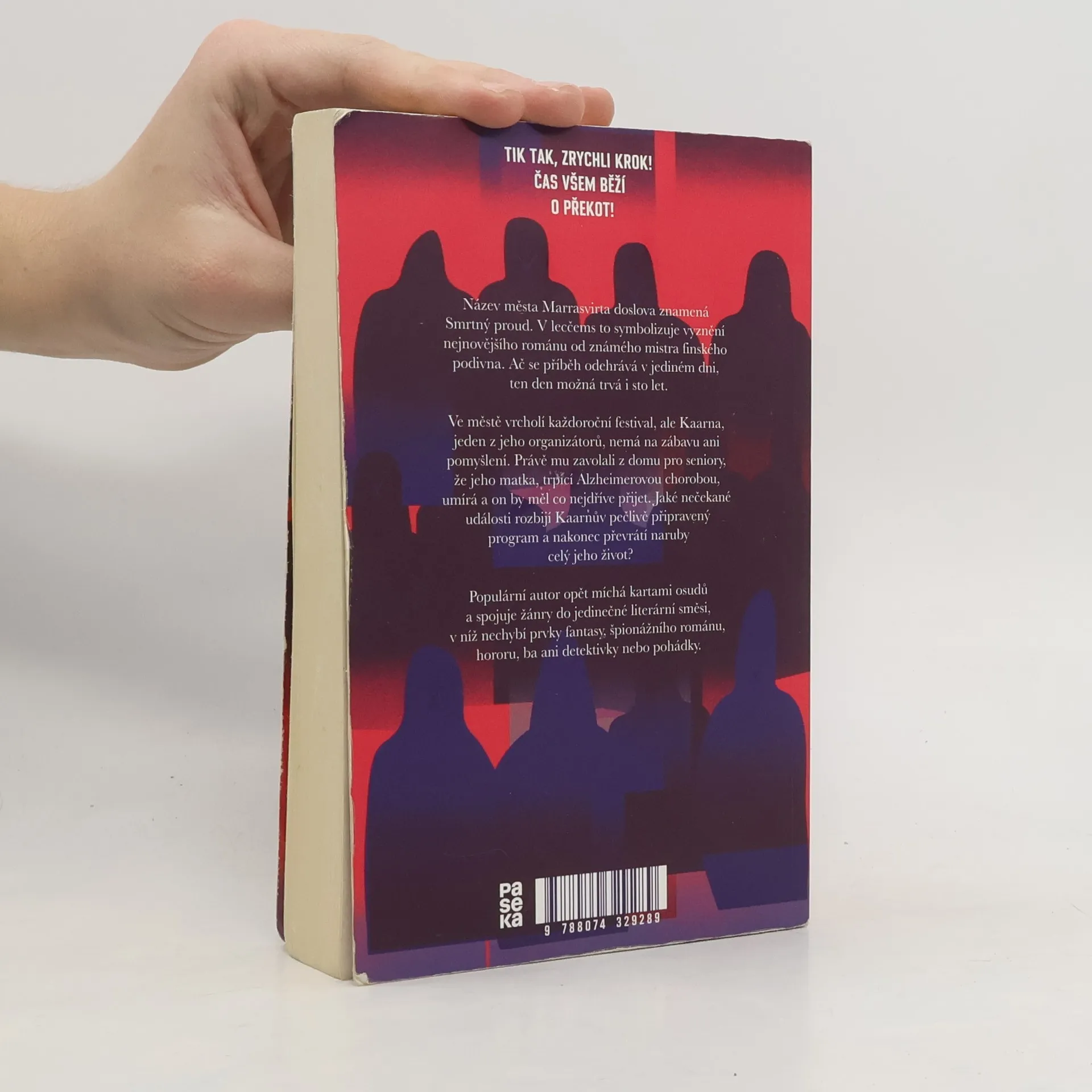 Název finského města Marrasvirta doslova znamená Smrtný proud, což v lecčems symbolizuje vyznění nejnovějšího románu od známého mistra finského podivna. Ač se příběh odehrává v jediném dni, ten den možná trvá i 100 let. Ve městě vrcholí každoroční festival, ale Kaarna, jeden z jeho organizátorů, nemá na zábavu ani pomyšlení. Právě mu zavolali z domu pro seniory, že jeho matka, trpící Alzheimerovou chorobou, umírá a on by měl co nejdříve přijet. Jaké nečekané události rozbijí Kaarnův pečlivě připravený program a nakonec převrátí naruby celý jeho život? Populární autor opět míchá kartami osudů a spojuje žánry do jedinečného finského podivna, v němž nechybí prvky fantasy, špionážního románu, hororu, ba ani detektivky nebo pohádky.