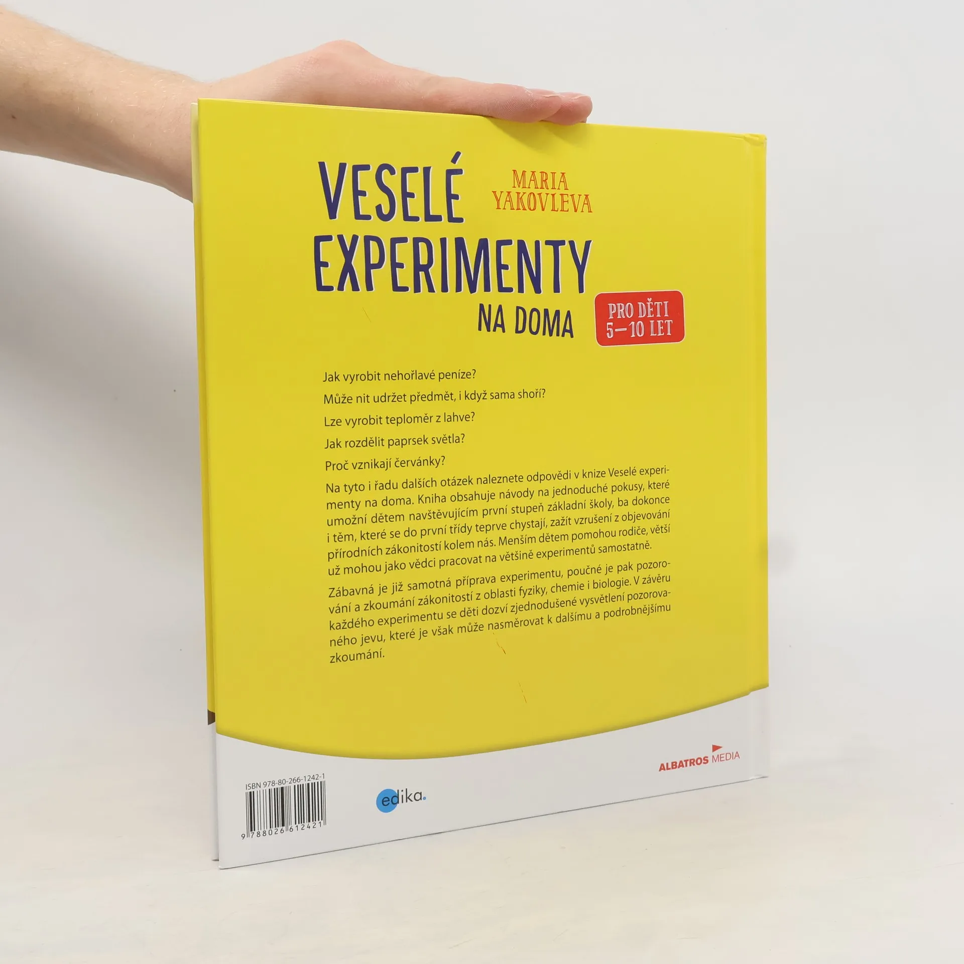 Jak vyrobit nehořlavé peníze? Může nit udržet předmět, i když sama shoří? Lze vyrobit teploměr z lahve? Jak rozdělit paprsek světla? Proč vznikají červánky? Na tyto i řadu dalších otázek naleznete odpovědi v knize Veselé experimenty na doma. Kniha obsahuje návody na jednoduché pokusy, které umožní dětem navštěvujícím první stupeň základní školy, ba dokonce i těm, které se do první třídy teprve chystají, zažít vzrušení z objevování přírodních zákonitostí…