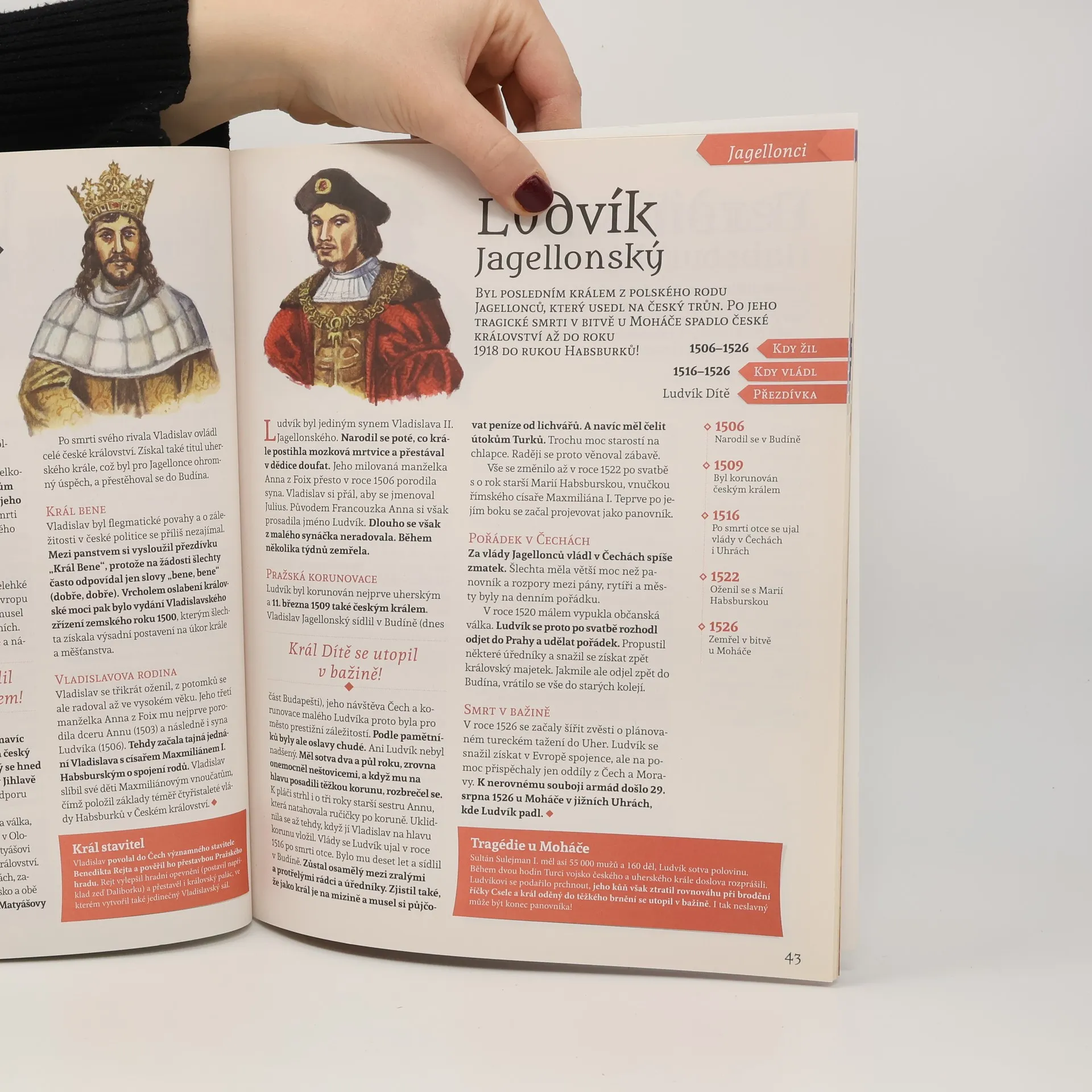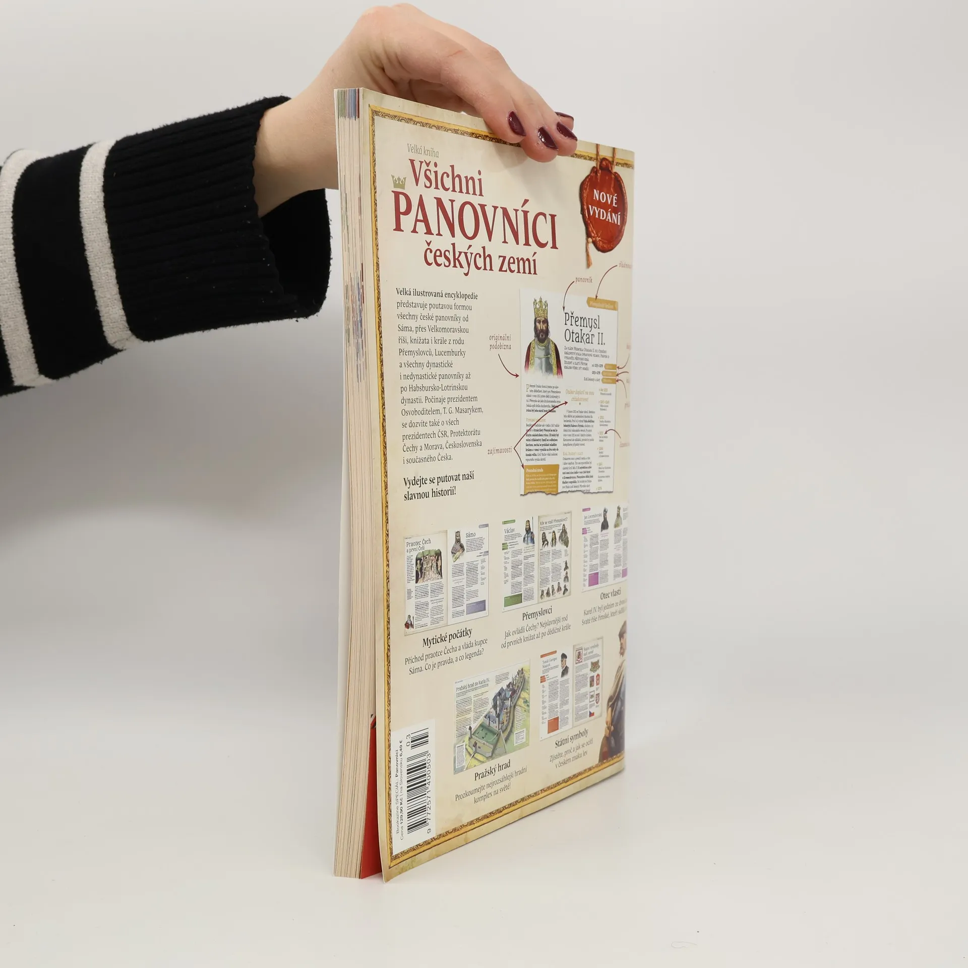 Velká ilustrovaná encyklopedie je určena především dětem a mládeži, ale čas od času po ní s chutí sáhne celá rodina. Představuje poutavou formou všechna knížata, krále i prezidenty – od Sáma, přes Velkomoravskou říši, Přemyslovce, Lucemburky a všechny dynastické i nedynastické pankovníky až po Habsbursko-Lotrinskou dynastii. Počínaje prezidentem Osvoboditelem, T. G. Masarykem, se dozvíte také o všech prezidentech ČSR, Protektorátu Čechy a Morava, Československa i současné České republiky až po zvoleného prezidenta Petra Pavla. Unikátní portréty od malíře Jana Hory doplňují nejen srozumitelné texty, ale i časové osy či infoboxy se zajímavostmi dané doby. Skvělá pomůcka od vydavatele dětského časopisu o historii Časostroj do hodin dějepisu i vlastivědy.
