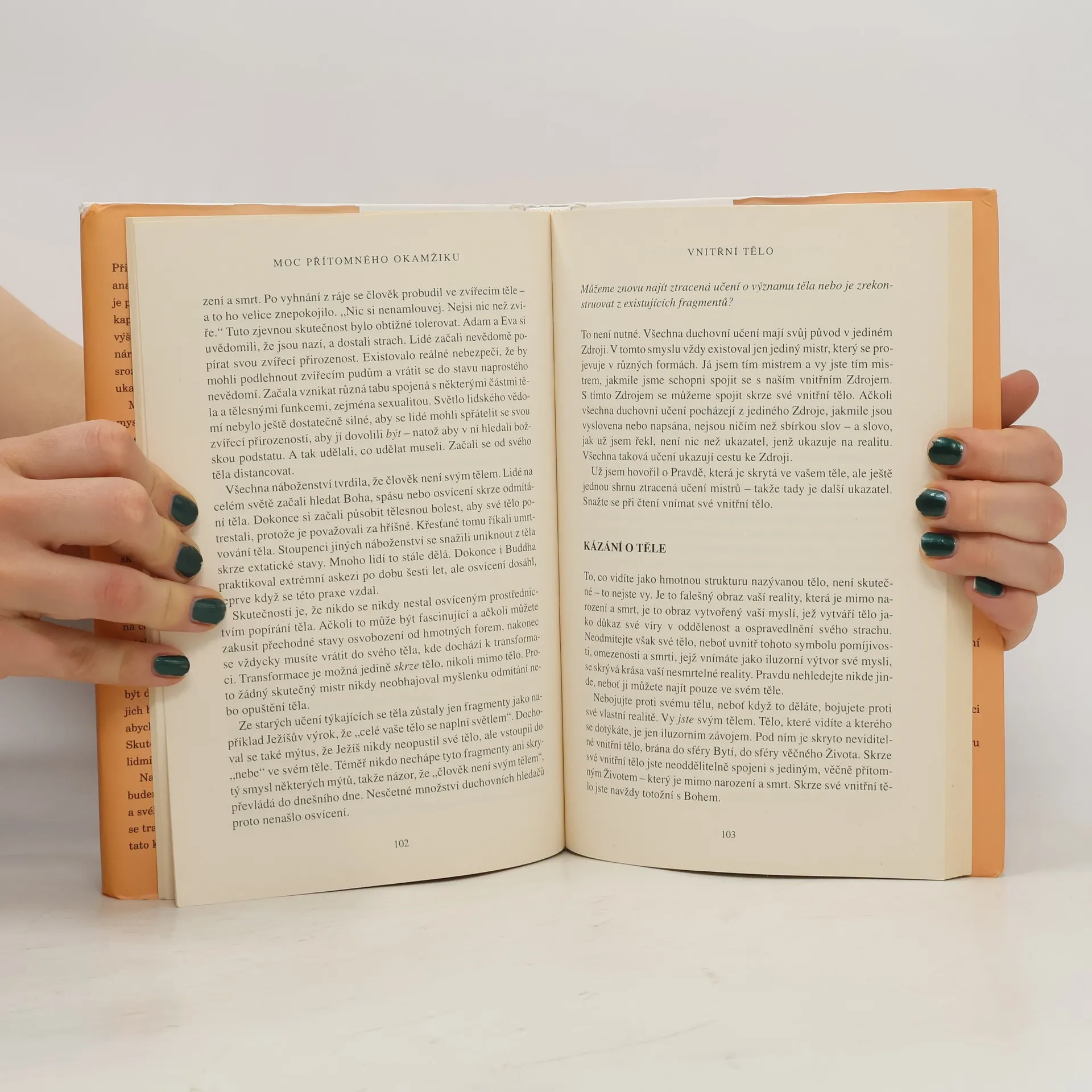 Při čtení této knihy mnoho z nás učiní nové objevy: nejsme svou myslí; můžeme se zbavit duševní bolesti; najdeme, jakmile se vzdáme přítomnému okamžiku. Dovíme se také, že jedním z klíčů k dosažení vnitřního klidu je naše tělo, stejně jako ticho a prostor kolem nás. To jsou brány, jimiž můžeme vstoupit do přítomnosti, kde neexistují žádné problémy. V přítomném okamžiku najdeme své skutečné já a hlubokou vnitřní radost. Pouze v přítomném okamžiku si uvědomíme, že už jsme úplní a dokonalí. Mnoho z nás zjistí, že naší největší překážkou na cestě k tomuto poznání jsou naše partnerské vztahy. Vstupujeme do ,,nového teritoria" a nic není takové, jak se nám to dosud jevilo. Pochopíme, že naše partnerské vztahy mohou být další branou k duchovnímu osvícení, pokud jich budeme užívat moudře, to jest k tomu, abychom se stali víc milujícími. Výsledek? Skutečné spojení mezi naším já a druhými lidmi. Naučíme-li se žít v přítomném okamžiku, budeme-li vnímat realitu ,,neviditelného Bytí" a svého ,,vnitřního těla", otevřeme se transformujícímu poznání, jež nám poskytuje tato kniha.