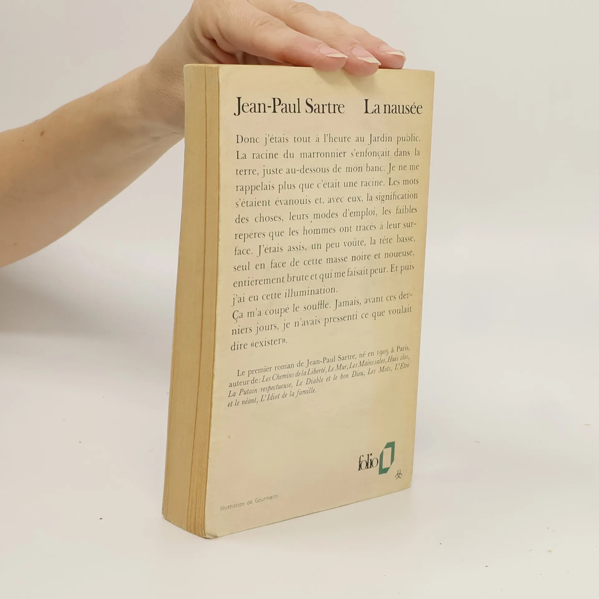 «Donc j'étais tout à l'heure au Jardin public. La racine du marronnier s'enfonçait dans la terre, juste au-dessous de mon banc. Je ne me rappelais plus que c'était une racine. Les mots s'étaient évanouis et, avec eux, la signification des choses, leurs modes d'emploi, les faibles repères que les hommes ont tracés à leur surface. J'étais assis, un peu voûté, la tête basse, seul en face de cette masse noire et noueuse entièrement brute et qui me faisait peur. Et puis j'ai eu cette illumination.Ça m'a coupé le souffle. Jamais, avant ces derniers jours, je n'avais pressenti ce que voulait dire "exister"».