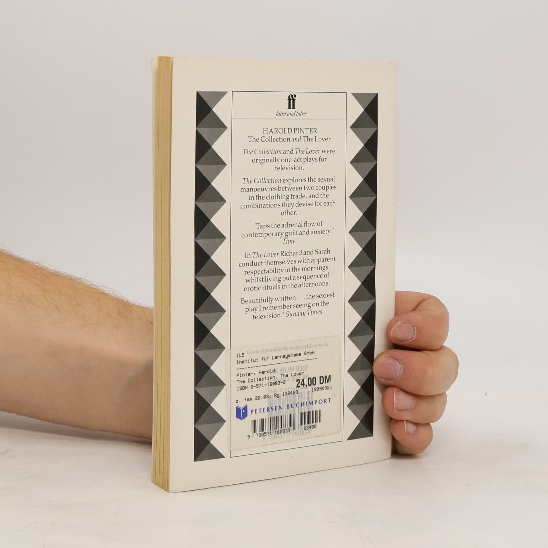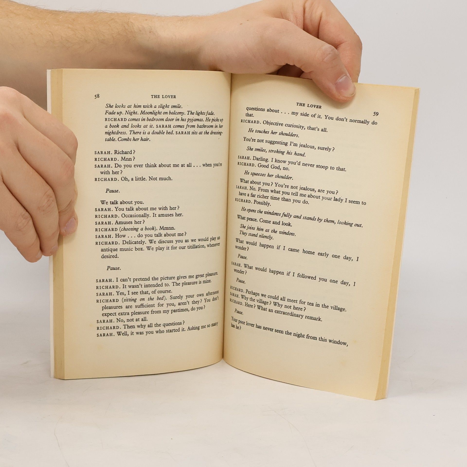 The Collection develops the themes of menace and lack of communication. The Lover is a one-act play for television, in which two characters play the double parts of wife-mistress and husband-lover. Also included is a short story, The Examination.