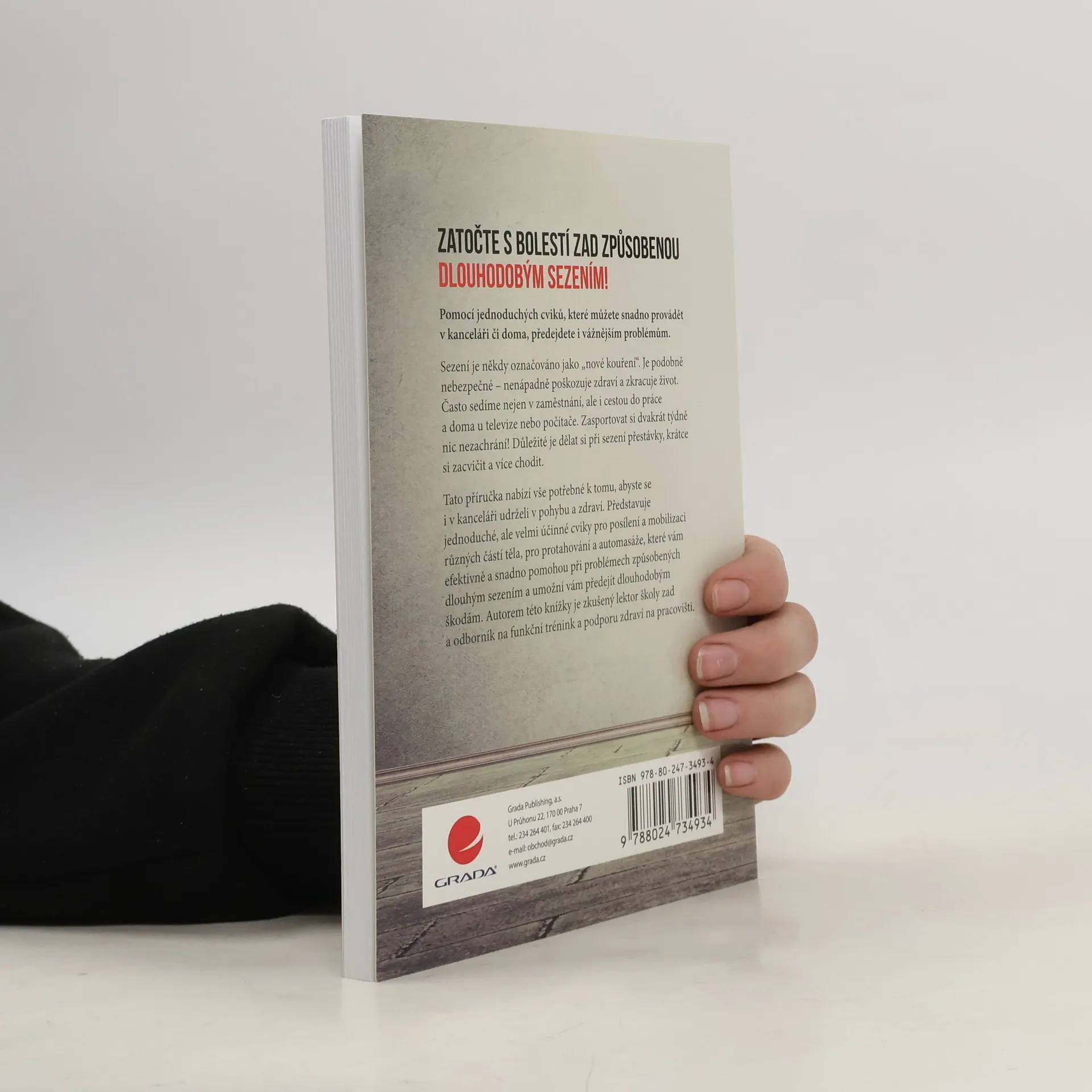 Zatočte s bolestí zad způsobenou dlouhodobým sezením! Pomocí jednoduchých cviků, které můžete snadno provádět v kanceláři či doma, předejdete i vážnějším problémům. Sezení je někdy označováno jako „nové kouření“. Je podobně nebezpečné – nenápadně poškozuje zdraví a zkracuje život. Často sedíme nejen v zaměstnání, ale i cestou do práce a doma u televize nebo počítače. Zasportovat si dvakrát týdně nic nezachrání! Důležité je dělat si při sezení přestávky, krátce si zacvičit a více chodit. Tato příručka nabízí vše potřebné k tomu, abyste se i v kanceláři udrželi v pohybu a zdraví. Představuje jednoduché, ale velmi účinné cviky pro posílení a mobilizaci různých částí těla, pro protahování a automasáže, které vám efektivně a snadno pomohou při problémech způsobených dlouhým sezením a umožní vám předejít dlouhodobým škodám. Autorem této knížky je zkušený lektor školy zad a odborník na funkční trénink a podporu zdraví na pracovišti.