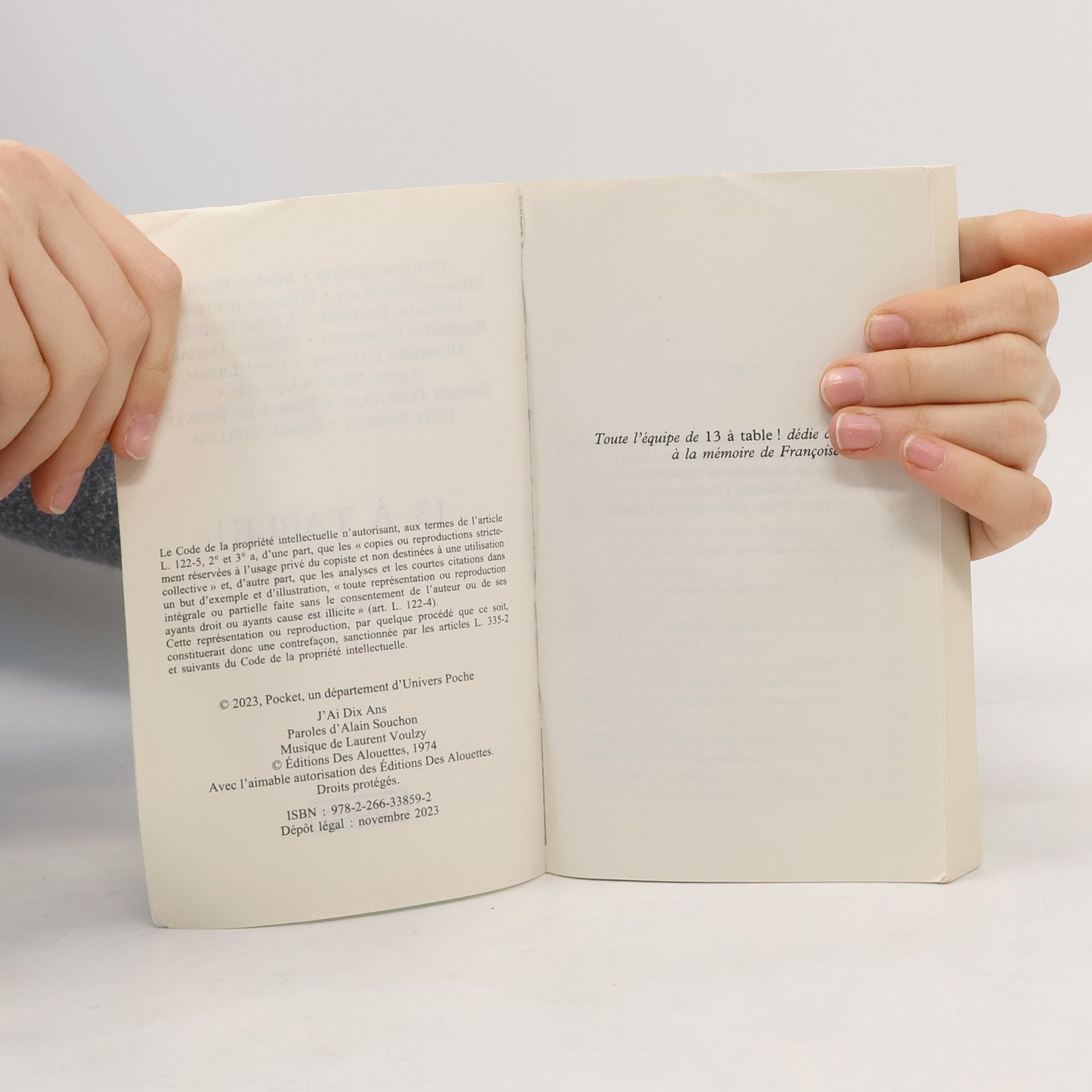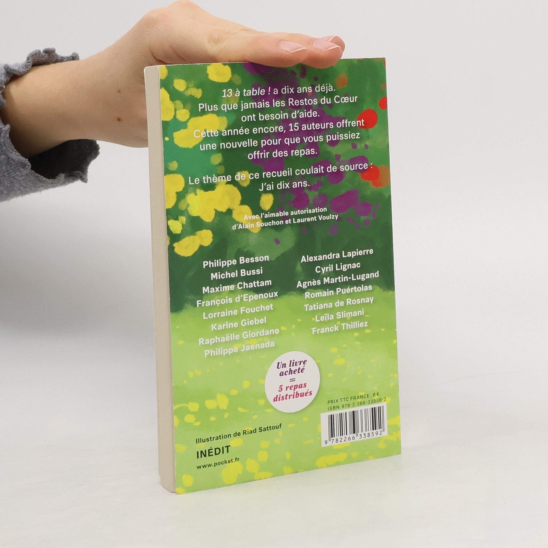 J'ai dix ans ! 13 à table ! a dix ans déjà.Plus que jamais les Restos du Cœur ont besoin d'aide.Cette année encore, 15 auteurs offrent une nouvelle pour que vous puissiez offrir des repas.Le thème de ce recueil coulait de source : J'ai dix ans.Avec l'aimable autorisation d'Alain Souchon et Laurent Voulzy.Philippe BessonMichel BussiMaxime ChattamFrançois d'EpenouxLorraine FouchetKarine GiebelRaphaëlle GiordanoPhilippe JaenadaAlexandra LapierreCyril LignacAgnès Martin-LugandRomain PuértolasTatiana de RosnayLeïla SlimaniFranck ThilliezIllustration de Riad Sattouf1 livre = 5 repasInédit