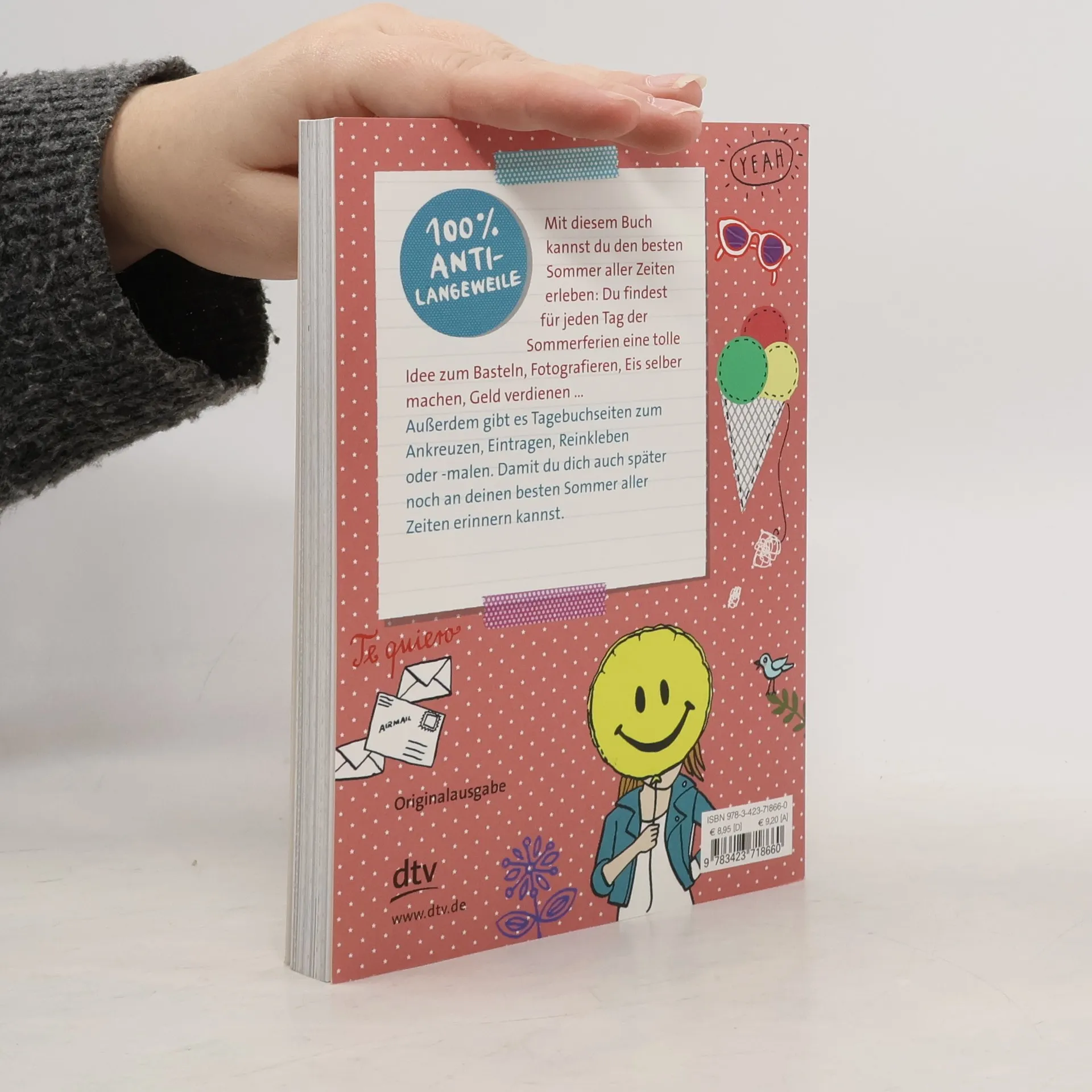 Das Buch bietet für jeden Tag der Sommerferien zwei Seiten zum Eintragen von Wetter, Stimmung und Aktivitäten sowie kreative Ideen wie Zimmerdeko gestalten, Glückskekse backen und alte Klamotten aufpeppen.