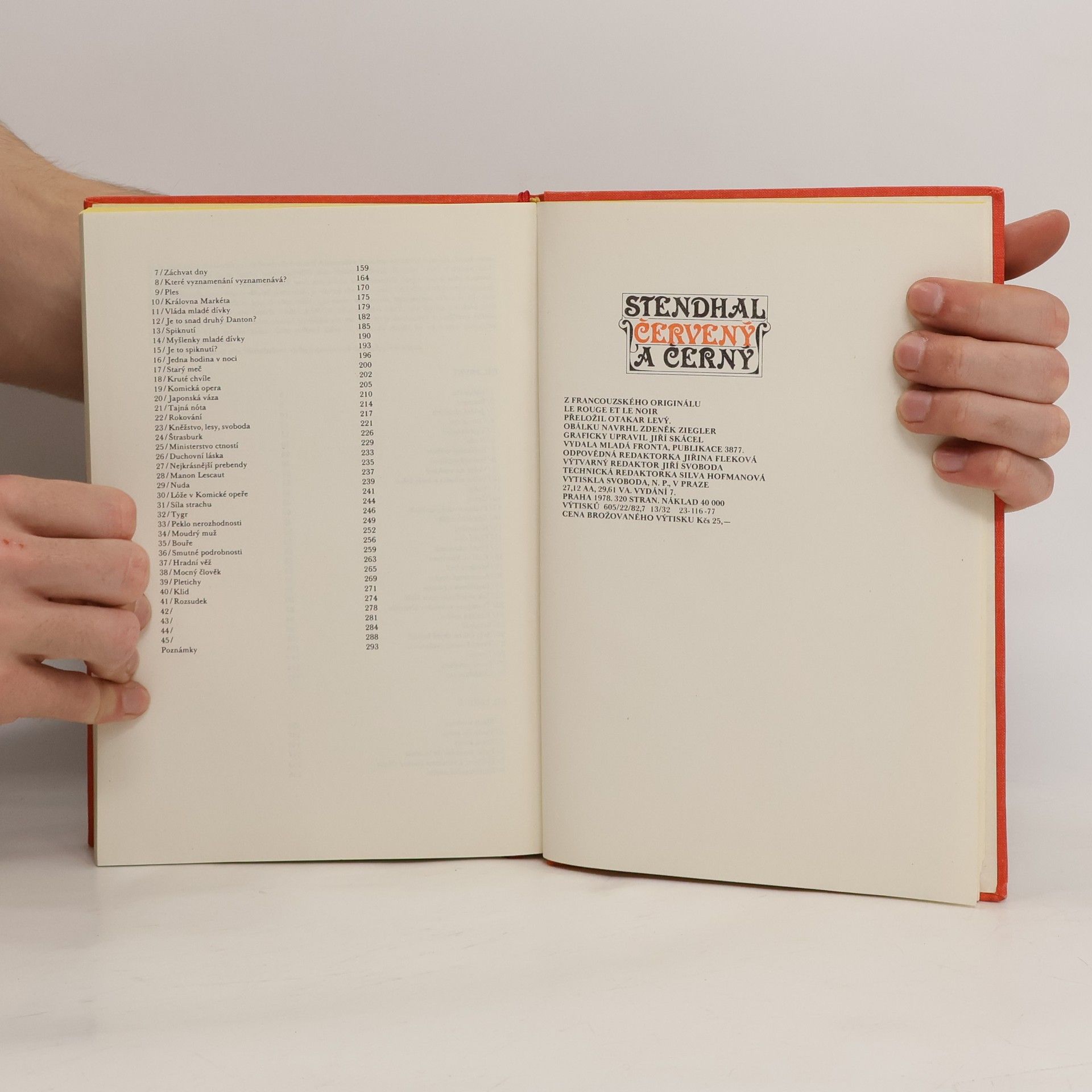Román, v němž Stendhal červenou barvou symbolizuje revoluci a černou barvou tmářství a despotismus. Syn vekovského dřevaře Julien Sorel chce dosáhnout v životě vynikajícího postavení. Potlačuje v sobě sympatie k Napoleonovi, protože jako jeho obdivovatel by ve stávajících politických poměrech by s nimi nemohl získat kariéru. Ačkoliv opovrhuje náboženstvím, dává se bez přesvědčení na kněžskou dráhu, neboť ta je nezbytným předpokladem ke kariéře, po níž touží. Sorel je pokrytec, který předstírá nebo utajuje city a názory podle toho, jak to vyžaduje jeho vlastní zájem. Svou ctižádost vnáší i do milostného poměru, který mu má pomáhat v kariéře. Postupně miluje dvě ženy, nejprve paní de Rénal, starostovu ženu, později, když pronikne do vysoké pařížské společnosti, Mathildu de la Mole. Sorel je však stále nespokojený, poznává, že ve střízlivé měšťanské době je každý úspěch problematický. Když postřelí paní de Renal a dostane se před soud, odmítá přijmout milost od společnosti, kterou nenávidí, a raději umírá na popravišti jakožto vzbouřený plebejec.