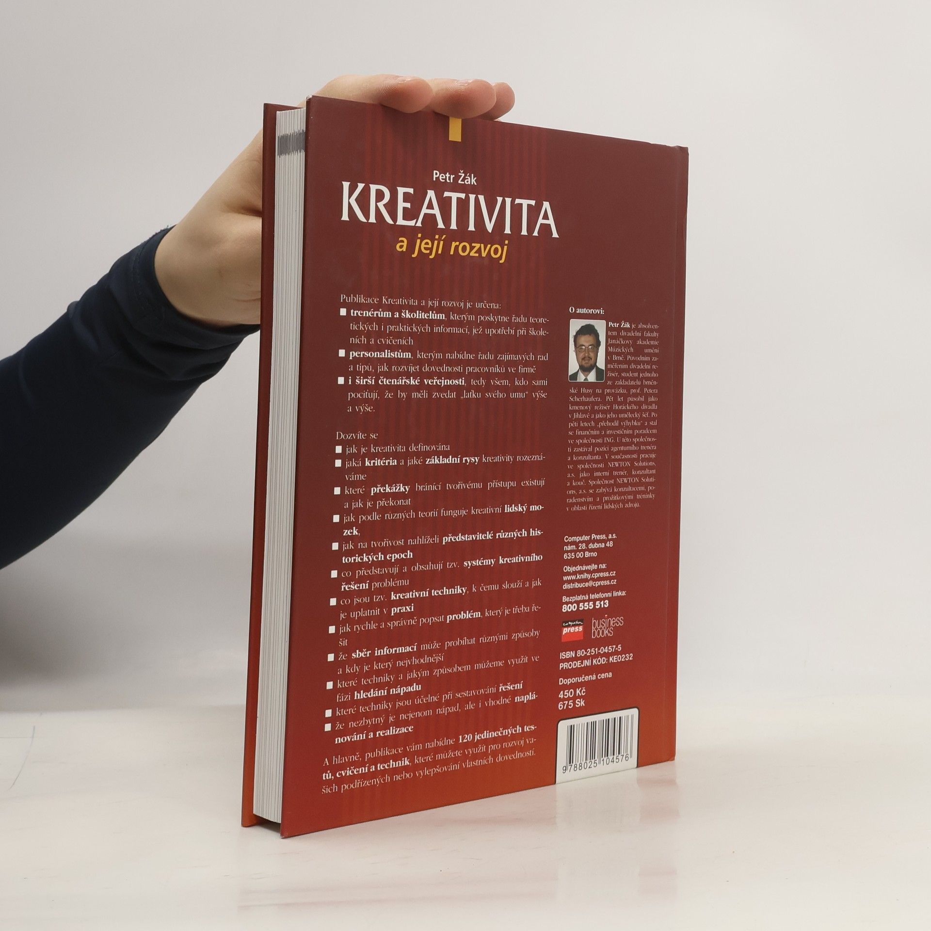 Publikace se zaměřuje na rozvoj kreativních schopností firemních zaměstnanců. Je určena trenérům a školitelům, kteří získají teoretické a praktické informace pro školení, personalistům, kteří najdou tipy na rozvoj dovedností pracovníků, a širší veřejnosti, která chce zlepšit své schopnosti. Obsahuje definice kreativity, kritéria a rysy, které ji charakterizují, a překážky, jež brání tvořivému přístupu, včetně způsobů, jak je překonat. Zkoumá, jak funguje kreativní mozek podle různých teorií a historických pohledů. Publikace představuje systémy kreativního řešení problémů a kreativní techniky, jejichž aplikace je praktická a účinná. Dále se zaměřuje na metody popisu problémů, sběr informací a techniky pro hledání nápadů a sestavování řešení. Důraz je kladen na plánování a realizaci nápadů. Publikace nabízí 120 unikátních testů, cvičení a technik pro rozvoj dovedností zaměstnanců i jednotlivců. Autor, Petr Žák, má zkušenosti jako divadelní režisér a trenér, nyní pracuje jako interní trenér a konzultant ve společnosti NEWTON Solutions, a.s., která se specializuje na poradenství v oblasti řízení lidských zdrojů.