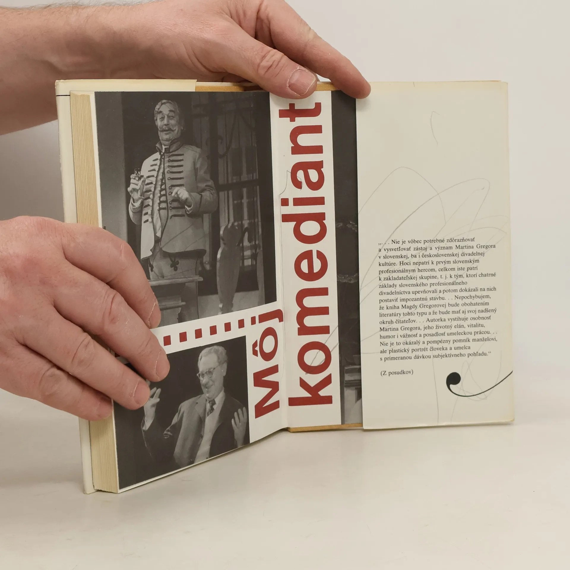 Magda Gregorová sa chytila pera a napísala vlastnými očami videný životopis manžela Martina Gregora. Pre odborníkov, ale aj pre širokú divácku divadelnú obec nemusíme zdôrazňovať, že ide o osobnosť mimoriadne zaujímavú, pre našu socialistickú kultúru neodmysliteľnú, ktorá ostane v jej dejinách natrvalo...Gregorovu tvorbu nikdy pravdivo neosvetlíme, ak sa nezamyslíme nad jeho mladosťou, nad jeho záľubami. Rovnako jeho optimizmus, humanistický postoj k životu, ktorý sa často ozýval z jeho tvorby, nepochopíme, ak si nesprítomníme tvrdosť životných skúšok, krutosť napríklad fašistickej doby a úľavu z oslobodenia...