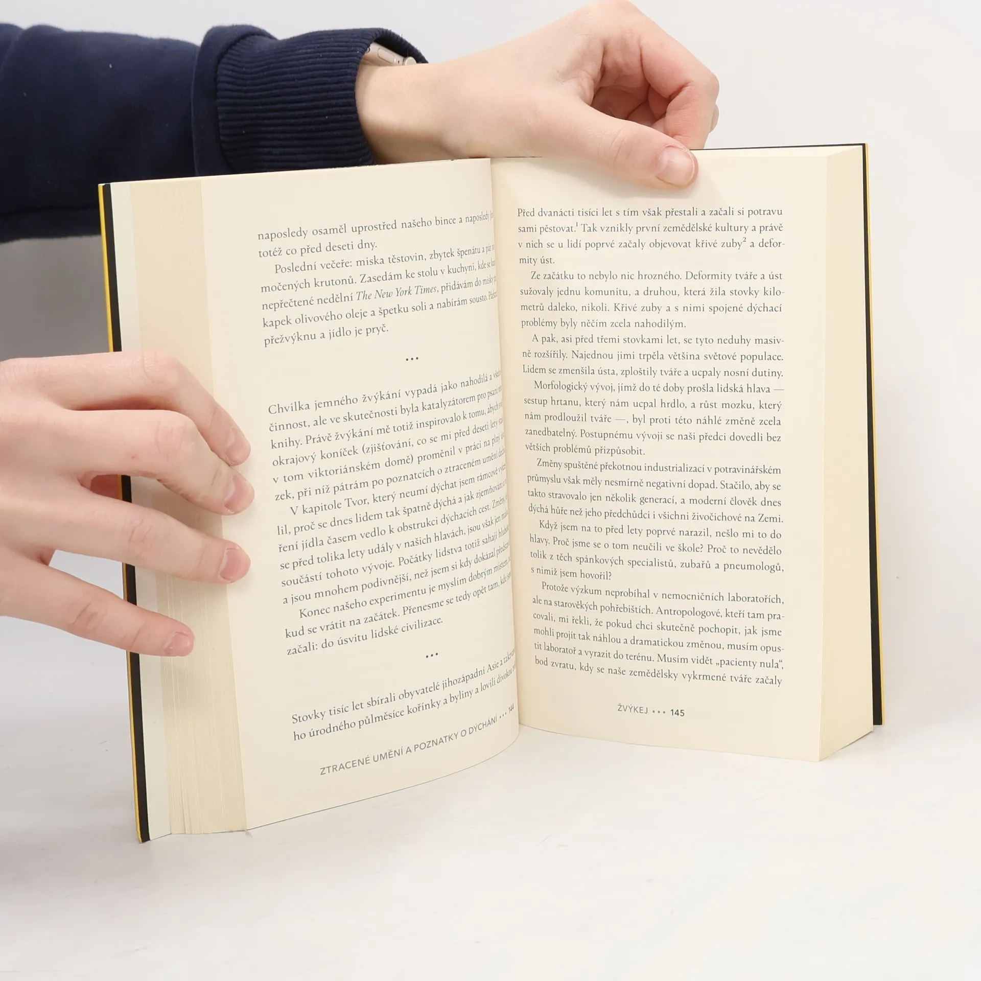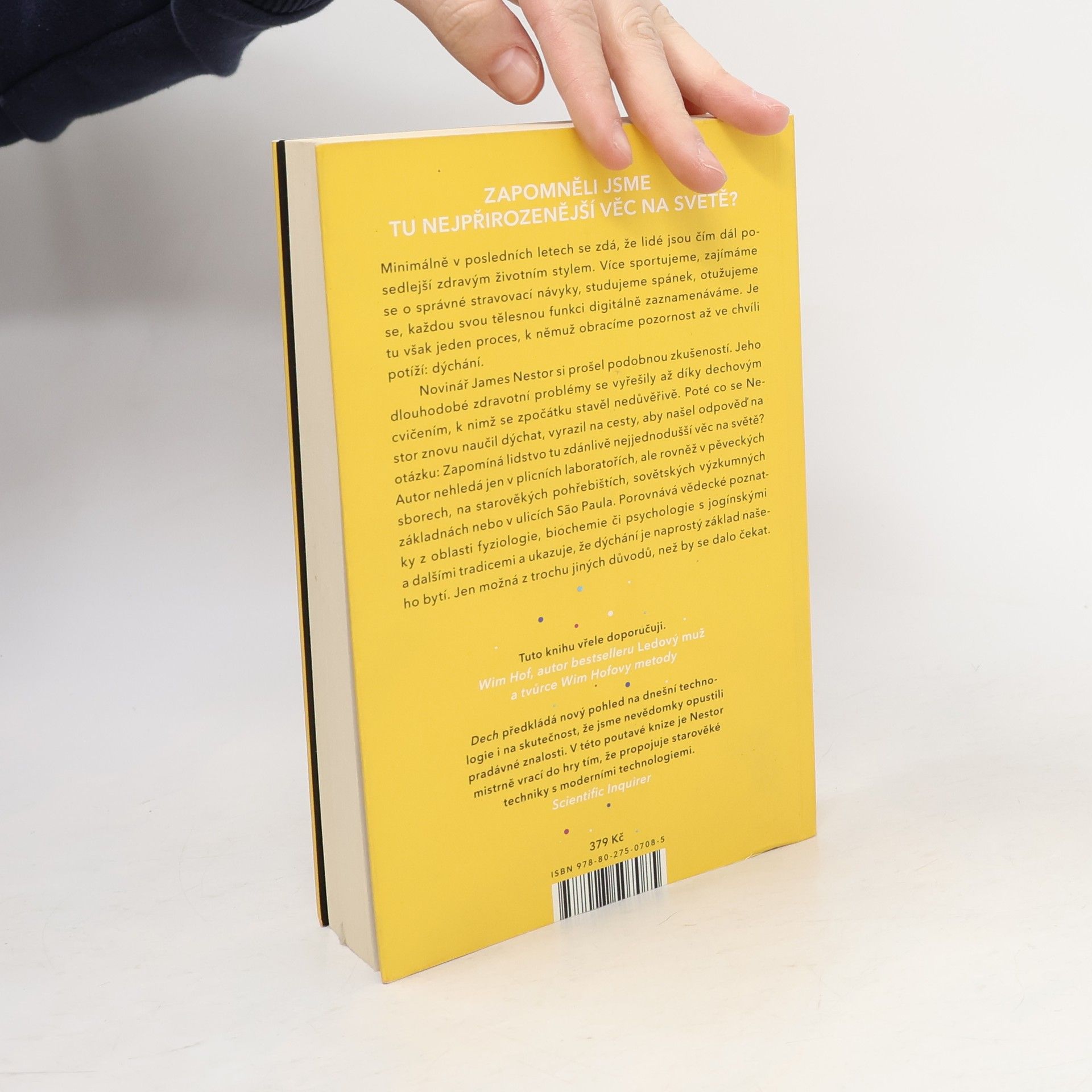 Nádech, výdech a znovu. Zapomněli jsme tu nejpřirozenější věc na světě? Minimálně v posledních letech se zdá, že lidé jsou čím dál posedlejší zdravým životním stylem. Více sportujeme, zajímáme se o správné stravovací návyky, studujeme spánek, otužujeme se, každou tělesnou funkci digitálně zaznamenáváme. Je tu však jeden proces, k němuž obracíme pozornost až ve chvíli potíží: dýchání. Novinář James Nestor si prošel podobnou zkušeností. Jeho dlouhodobé zdravotní problémy se vyřešily až díky dechovým cvičením, k nimž se zpočátku stavěl nedůvěřivě. Poté co se Nestor znovu naučil dýchat, vyrazil na cesty, aby našel odpověď na otázku: Zapomíná lidstvo tu zdánlivě nejjednodušší věc na světě? Autor nehledá jen v plicních laboratořích, ale rovněž u pěveckých sborů, na starověkých pohřebištích, sovětských výzkumných základnách nebo v ulicích Săo Paula. Porovnává vědecké poznatky z oblasti fyziologie, biochemie či psychologie s jogínskými a dalšími tradicemi a ukazuje, že dýchání je naprostý základ našeho bytí. Jen možná trochu jinak, než by se dalo čekat.