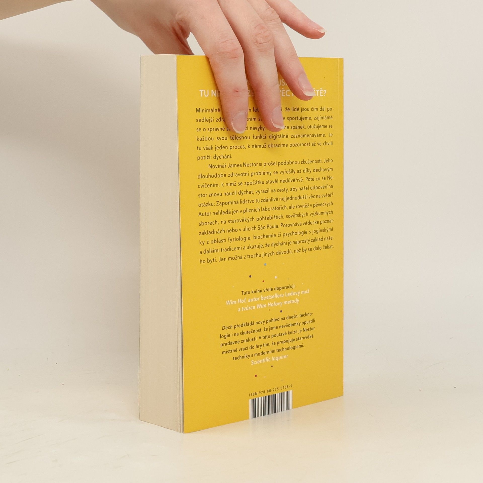 Nádech, výdech a znovu. Zapomněli jsme tu nejpřirozenější věc na světě? Minimálně v posledních letech se zdá, že lidé jsou čím dál posedlejší zdravým životním stylem. Více sportujeme, zajímáme se o správné stravovací návyky, studujeme spánek, otužujeme se, každou tělesnou funkci digitálně zaznamenáváme. Je tu však jeden proces, k němuž obracíme pozornost až ve chvíli potíží: dýchání. Novinář James Nestor si prošel podobnou zkušeností. Jeho dlouhodobé zdravotní problémy se vyřešily až díky dechovým cvičením, k nimž se zpočátku stavěl nedůvěřivě. Poté co se Nestor znovu naučil dýchat, vyrazil na cesty, aby našel odpověď na otázku: Zapomíná lidstvo tu zdánlivě nejjednodušší věc na světě? Autor nehledá jen v plicních laboratořích, ale rovněž u pěveckých sborů, na starověkých pohřebištích, sovětských výzkumných základnách nebo v ulicích Săo Paula. Porovnává vědecké poznatky z oblasti fyziologie, biochemie či psychologie s jogínskými a dalšími tradicemi a ukazuje, že dýchání je naprostý základ našeho bytí. Jen možná trochu jinak, než by se dalo čekat.