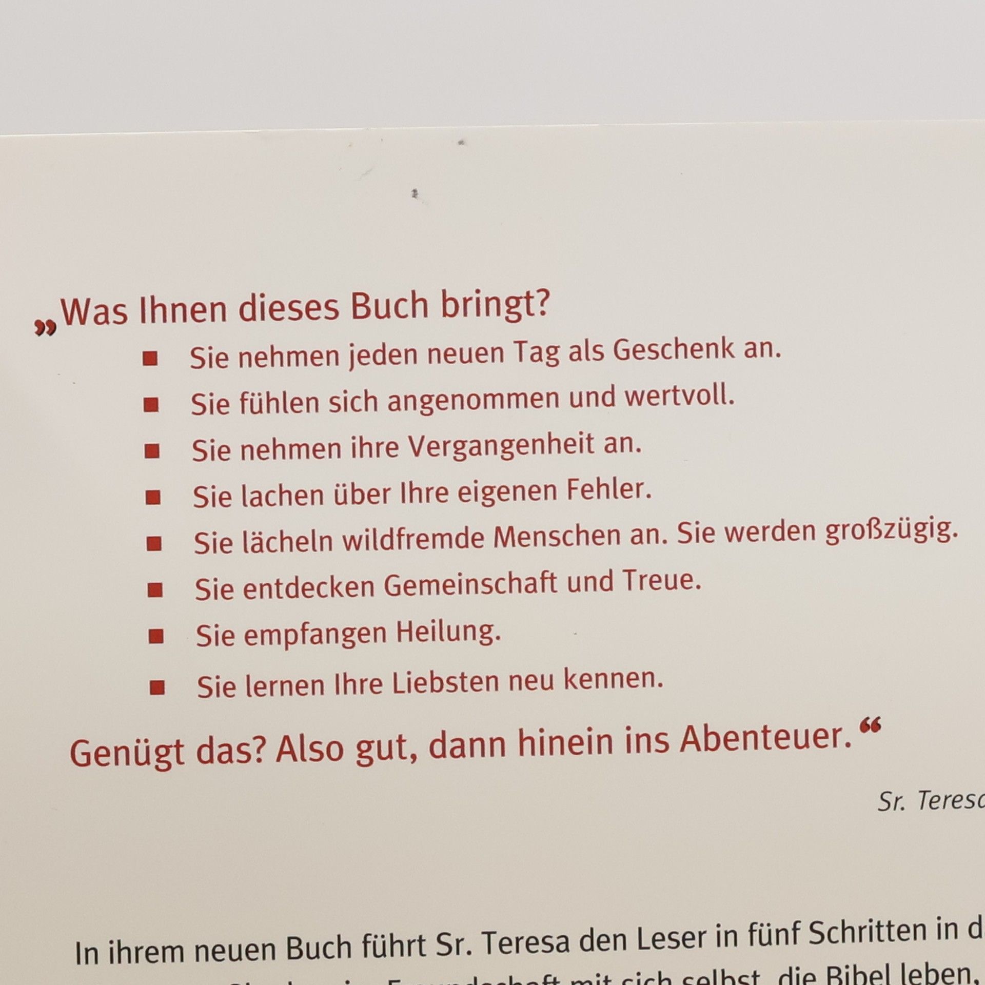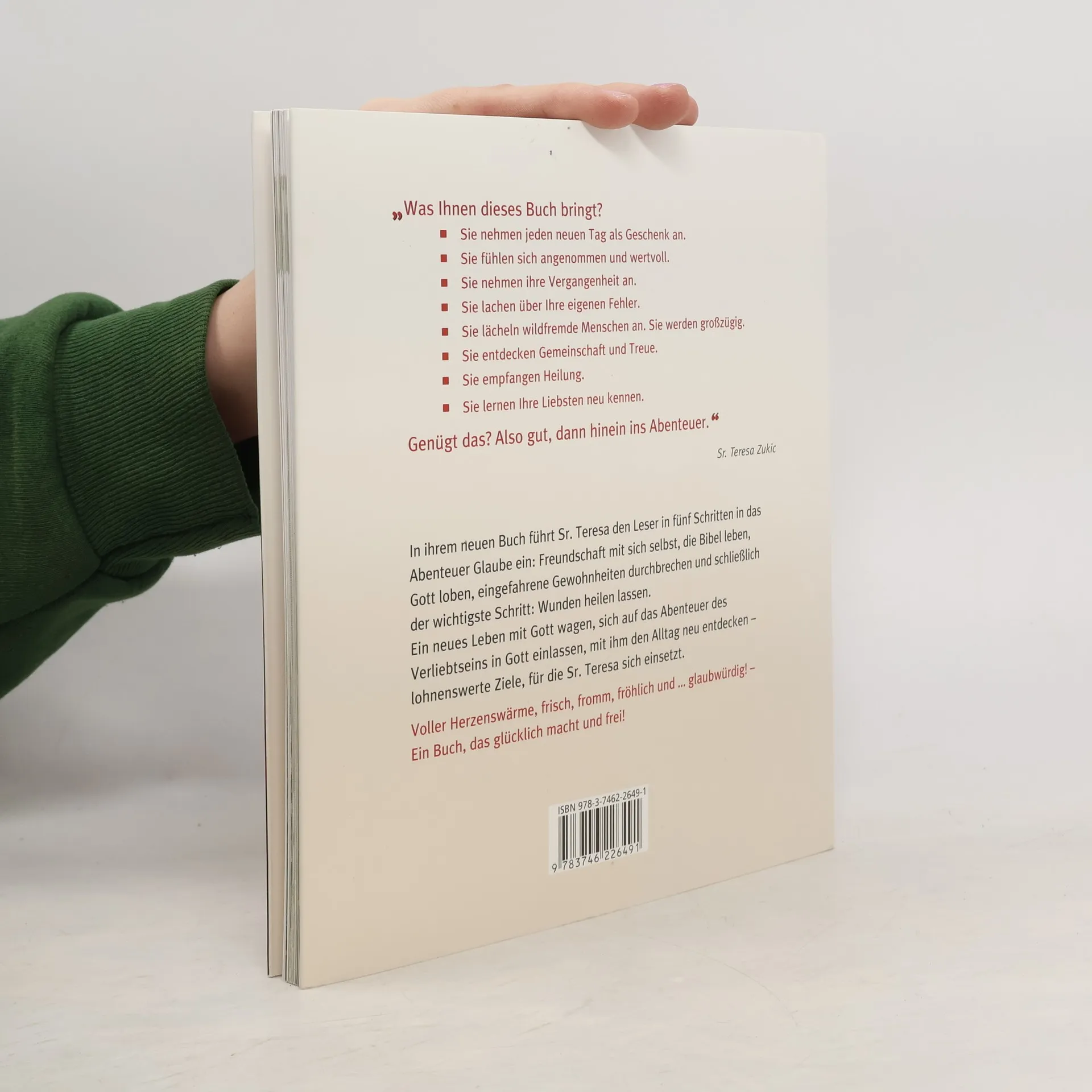 Mit Sr. Teresa Zukic wird der christliche Glaube zum Abenteuer. Als Skateboard fahrende Nonne wurde sie in ganz Deutschland bekannt, und seither begeistert die Powerfrau Menschen für ein aufregend lebendiges Christsein. In diesem spirituellen Leitfaden bringt sie ihre Botschaft auf den Punkt: Glaube kann das eigene Leben verwandeln. Fünf konkrete Schritte sind es, die den Glauben ins Leben holen: mit sich selbst Freundschaft schließen, selbst zur Bibel werden, Gott loben, Ungewohntes wagen, Wunden heilen lassen. Die spürbare Energie und Lebensfreude, mit der Sr. Teresa Zukic schreibt, wirkt ansteckend und lässt Sie die Freude am Glauben (wieder-) entdecken.