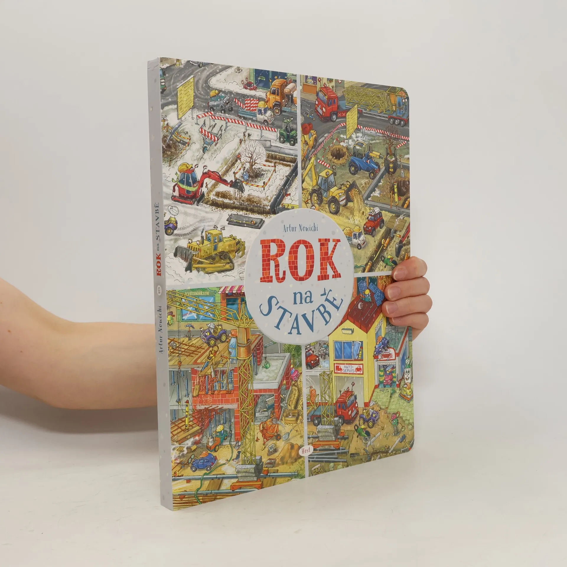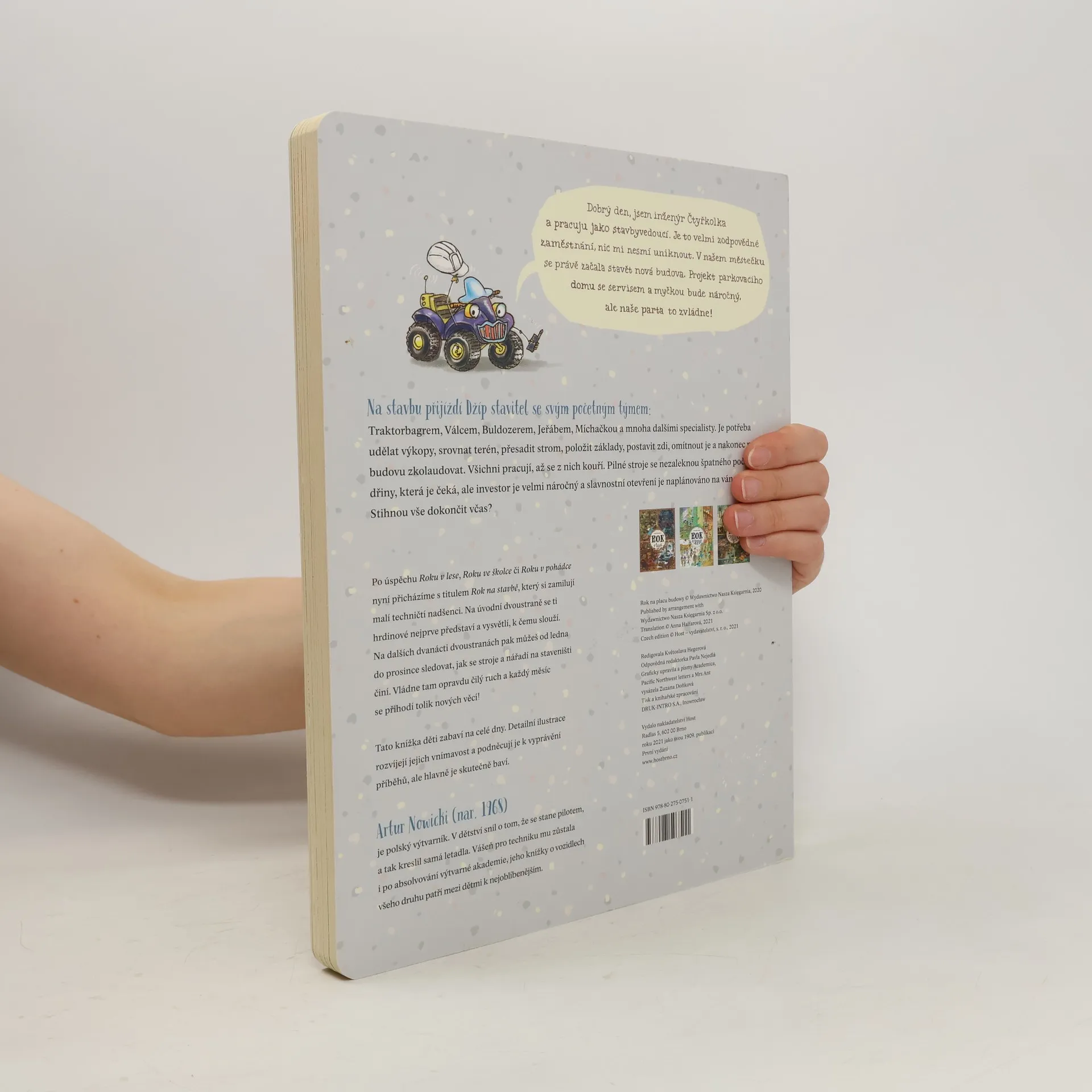 Konečně přírůstek do rodiny Roků, který uspokojí malé technické nadšence! S vášní pro vozidla se některé děti rodí. A zejména stavební stroje v nich vzbuzují úžas srovnatelný s fascinací jiného dětského kmene — pro dinosaury. Poznáte je snadno. Jejich první slovo není „máma“, ale „moto“. Hřiště je nebaví, zato na nedalekém staveništi dokážou dělat odborný stavební dozor klidně půl směny. Ve dvou letech vám vysvětlí rozdíl mezi bagrem pásovým a kolovým a na rozdíl od vás vědí, že žába neskáče jen po blátě, ale taky na stavbě a ve skutečnosti se jí říká vibrační pěch. Po úspěšném Roku v lese, Roku ve školce či Roku v pohádce přibude do této série další svazek — Rok na stavbě. Od ledna do prosince můžete sledovat čilý ruch na staveništi: od vyměřování přes terénní úpravy a výstavbu až po závěrečnou kolaudaci. Polidštěné stavební stroje a další užitečné nástroje mají osobitý charakter a jejich pracovní nasazení lze sledovat v rámci daného měsíce i napříč celým rokem. Přehledně je představí úvodní dvoustrana, která dětem (i vám! ) osvětlí mnohé technické procesy související se stavbou.