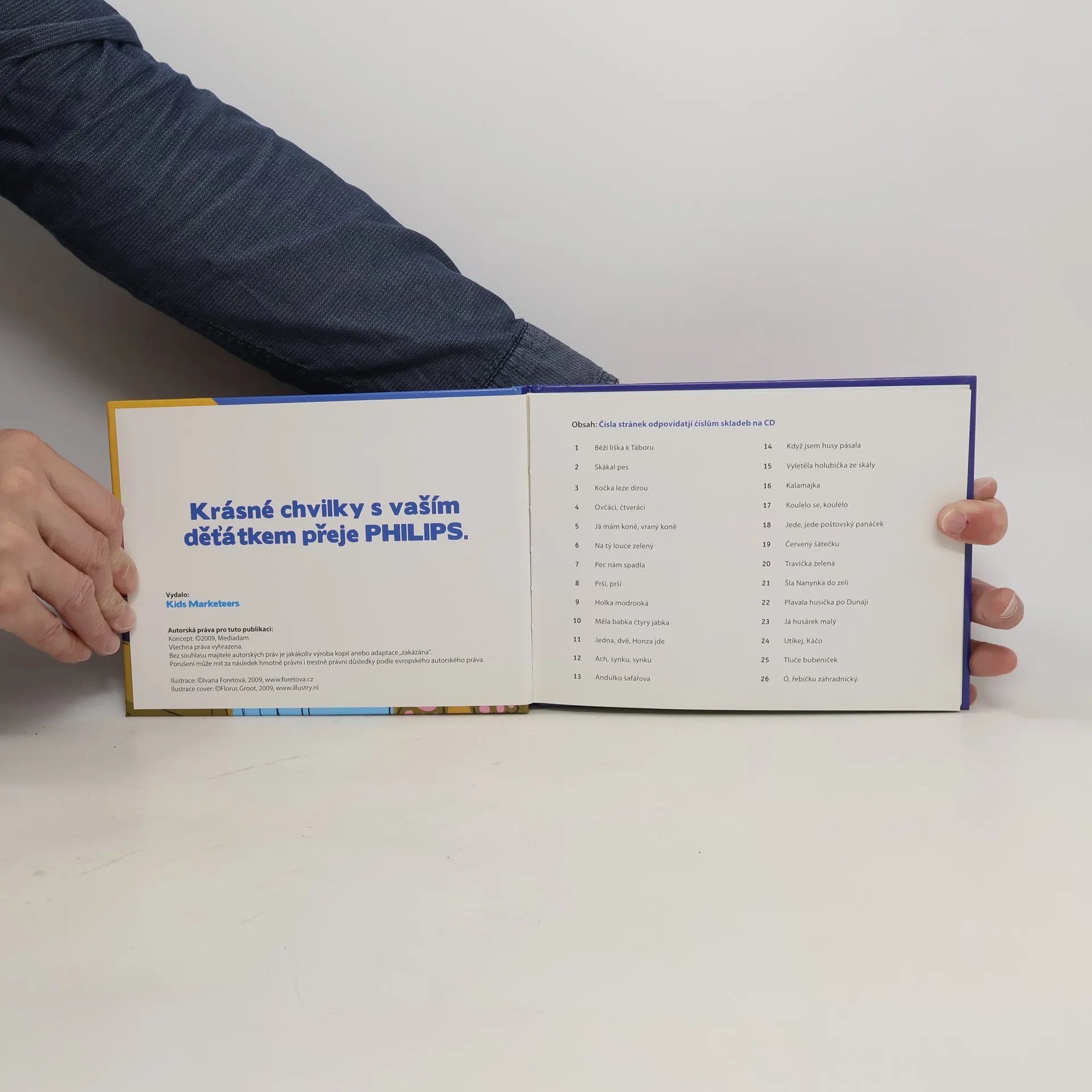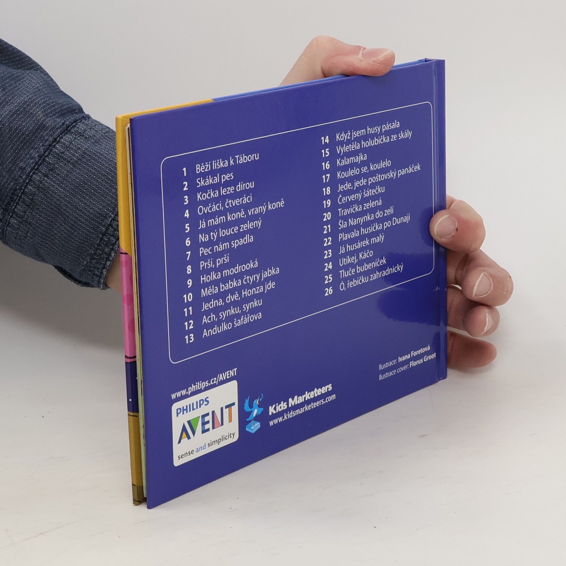 Kniha obsahuje texty 26 písniček: 1. Běží liška k Táboru 2. Skákal pes 3. Kočka leze dírou 4. Ovčáci, čtveráci 5. Já mám koně, vraný koně 6. Na tý louce zelený 7. Pec nám spadla 8. Prší, prší 9. Holka modrooká 10. Měla babka čtyry jabka 11. Jedna, dvě, Honza jde 12. Ach, synku, synku 13. Andulko šafářova 14. Když jsem husy pásala 15. Vyletěla holubička ze skály 16. Kalamajka 17. Koulelo se, koulelo 18. Jede, jede poštovský panáček 19. Červený šátečku 20. Travička zelená 21. Šla Nanynka do zelí 22. Plavala husička po Dunaji 23. Já husárek 24. Utíkej, Káčo 25. Tluče bubeníček 26. Ó, řebíčku zahradnický