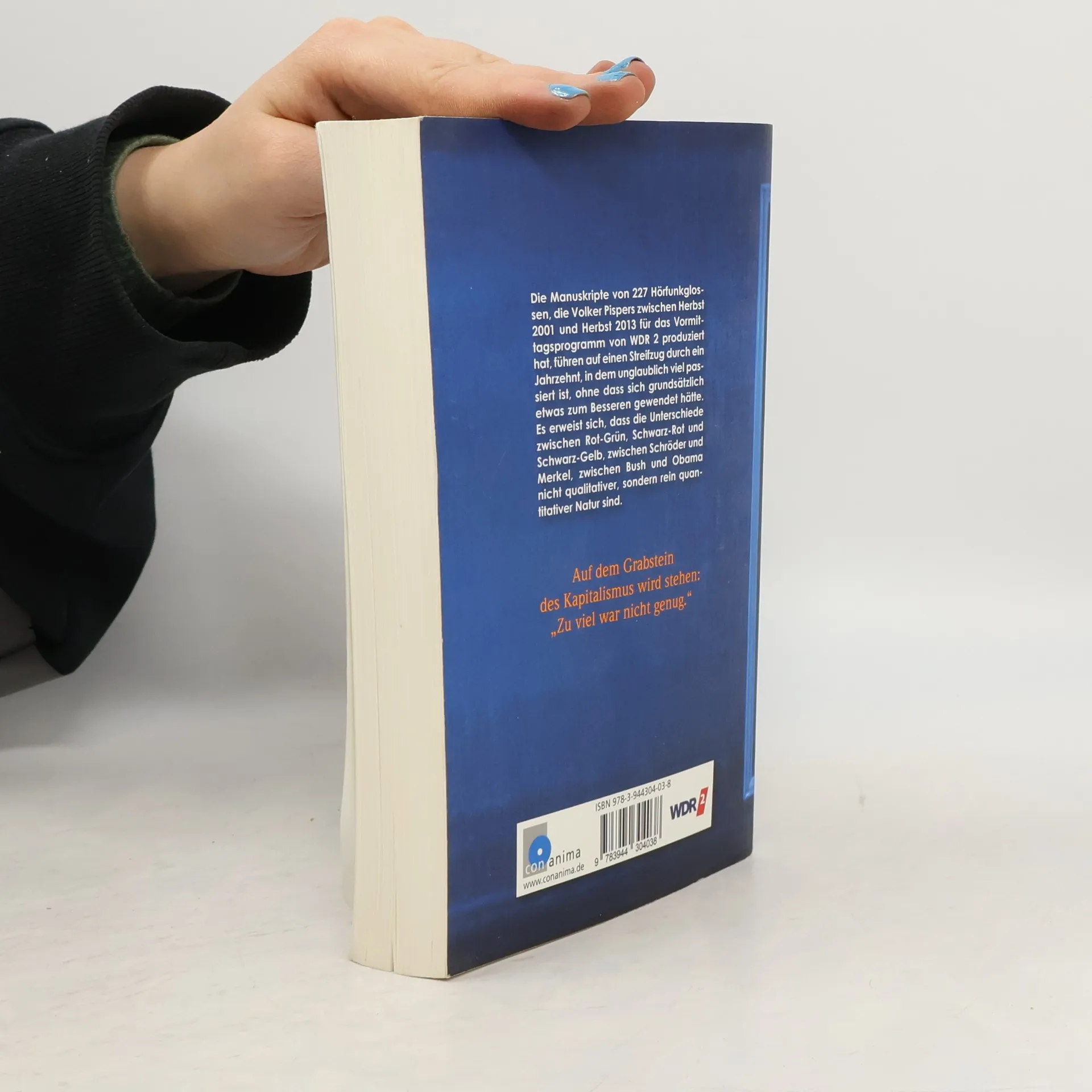 Das Buch enthält die Manuskripte von 227 Hörfunkglossen, die Volker Pispers zwischen Herbst 2001 und Herbst 2013 für das Vormittagsprogramm von WDR 2 produziert hat. Sie führen auf einen Streifzug durch ein Jahrzehnt, in dem unglaublich viel passiert ist, ohne dass sich grundsätzlich etwas zum Besseren gewendet hätte. Es erweist sich, dass die Unterschiede zwischen Rot-Grün, Schwarz-Rot und Schwarz-Gelb, zwischen Schröder und Merkel, zwischen Bush und Obama nicht qualitativer, sondern rein quantitativer Natur sind.