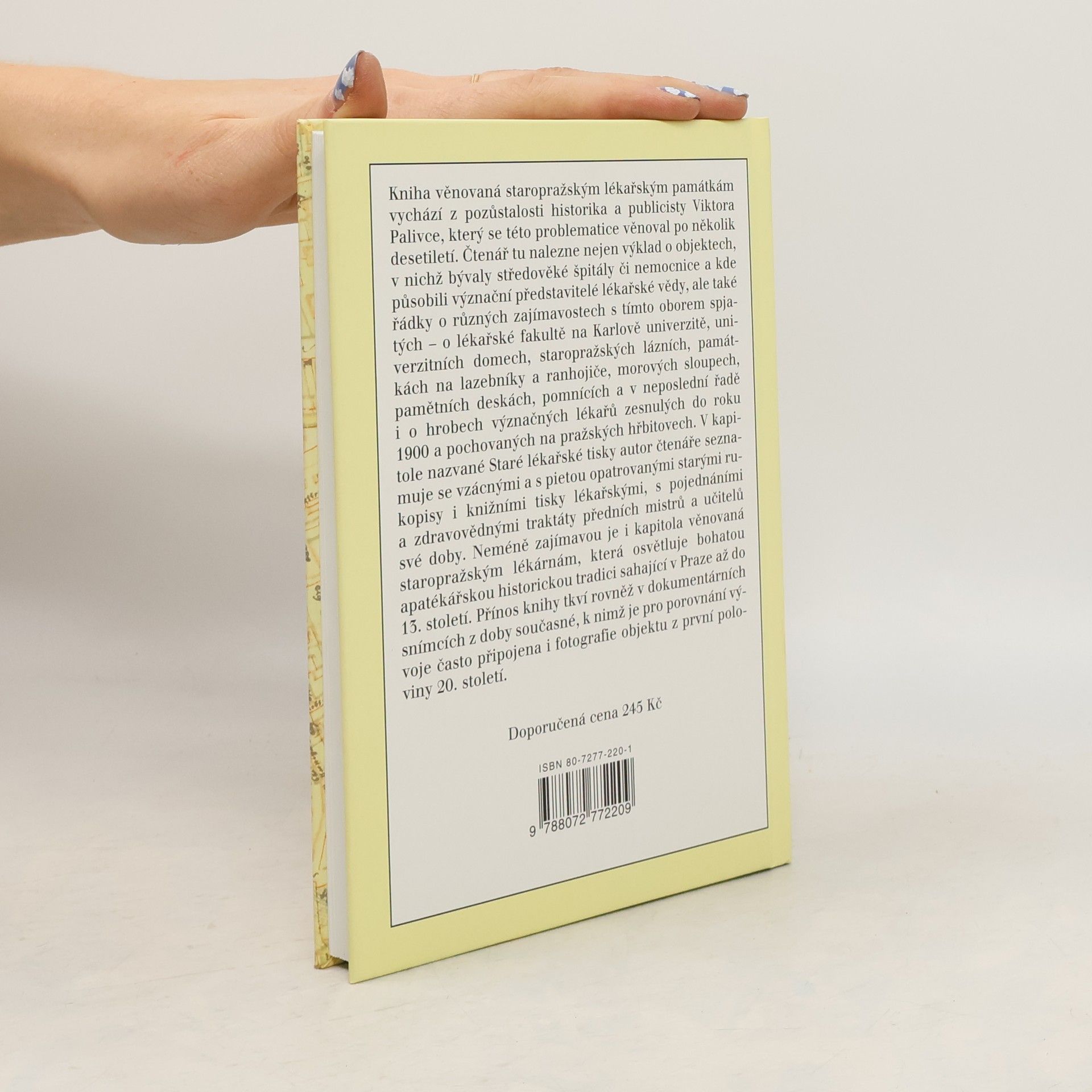 Kniha vychází z pozůstalosti historika a publicisty, který se problematice věnoval po několik desetiletí. Čtenář nalezne nejen výklad o domech, kde bydleli významní či slavní představitelé lékařské vědy, budovy s tímto oborem spojené (mistrovské koleje i učiliště), ale i působiště alchymistů hledajících elixír života. Zahrnuje staropražské apatyky a špitály, střdověké lázně, památky na lazebníky i ranhojiče, pražské morové sloupy, ale i archivy a knihovny se starými lékařskými tisky, herbáři a také mnoho muzejních exponátů od lékařských nástrojů po amulety.