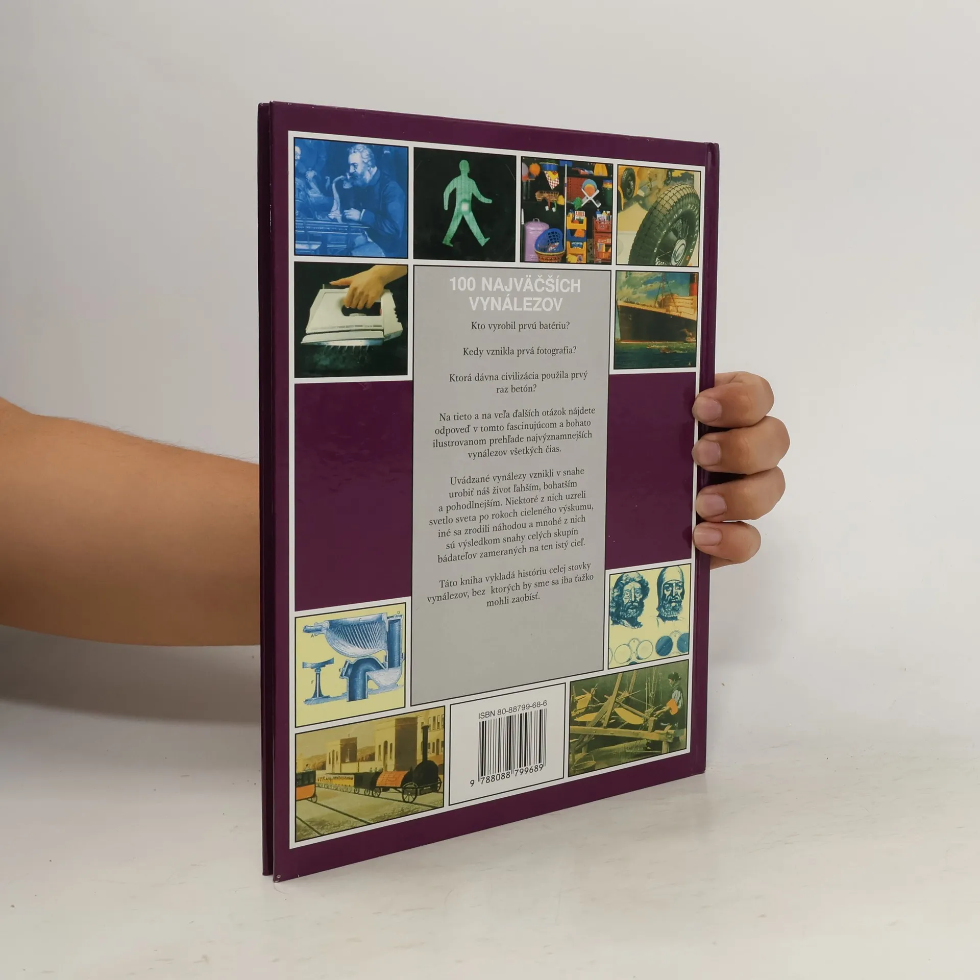 Bohato ilustrovaný prehľad najvýznamnejších vynálezov všetkých čias. Obsah: Tkanie, Plachty, Píla, Zámka, Koleso, Hrnčiarsky kruh, Sklo, Mapy, Pluh, Abeceda, Spracovanie železa, Farbenie, Teplomer, Skrutka, Betón, Kompas, Papier, Kalendár, Veterný mlyn, Hodiny, Papierové peniaze, Okuliare, Pradenie, Mikroskop, Hodinky, Ďalekohľad, Ponorka, Zápalky, Sejačka, Umelý chrup, Parník, Splachovací záchod, Mláťačka, Batérie, Konzerva, Písací stroj, Šijací stroj, Železnica, Bicykel, Metro, Lodná skrutka, Pneumatika, Zatvárací špendlík, Výťah, Chladnička, Ostnatý drôt, Margarín, Plasty, Zošívačka, Svetelná signalizácia, Mechanická metla, Telefón, Elektrická žiarovka, Elektrická žehlička, Umelé vlákna, Plniace pero, Automobil a motocykel, Termoska, Fotografovanie Eskalátor, Registračná pokladnica, Vstrekovací motor, Zips, Holiaci strojček, Film, Spinka na spisy, Vysávač, Rádio, Kosačka, Načúvací prístroj, Lietadlo, Mrazená potrava, Práčka, Fax, Vrtuľník, Chemické hnojivá, Krídlový čln, Kombajn, Nehrdzavejúca oceľ, Pracie prostriedky, Aerosól, Televízia, Lepiaca páska, Magnetofón, Reaktívny motor, Parkovacie hodiny, Rozpustná káva, Guľôčkové pero, Mikrovlnka, Počítač, Chemické pesticídy, Dlhohrajúca platňa (LP), Tranzistor, Úverová karta, Teflónová panvica, Videorekordér, Kopírovačka, Mikroprocesor, Elektronická kalkulačka, Kompaktný disk.