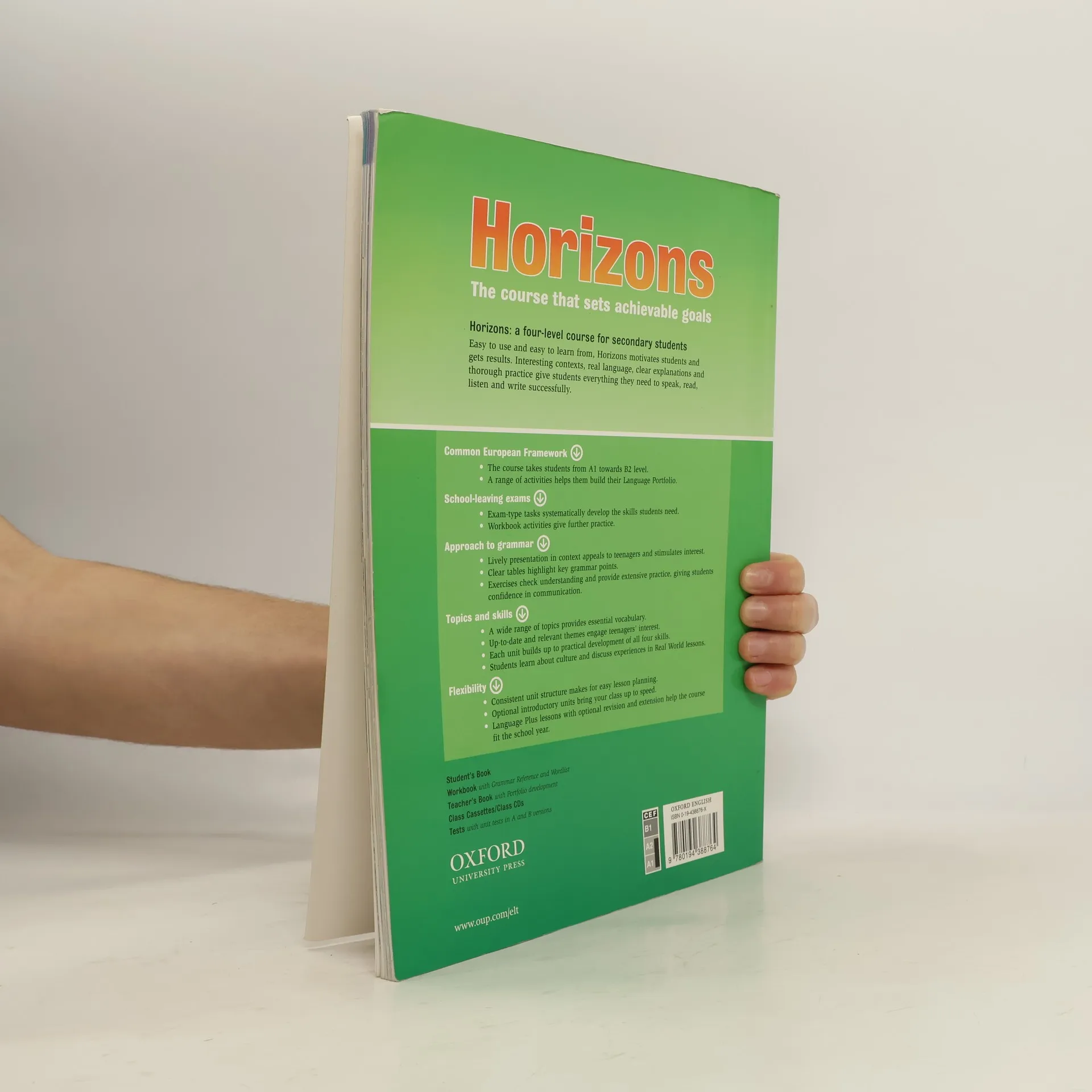 Multiple entry points cater for different teaching situations. Optional Starter unit for real beginners (level 1) or mixed classes (all levels) to revise basics. Horizons can be completed in a typical school-year. Grammar is presented in the context of dialogues, and practised systematically. Training for pre-intermediate and intermediate level exams. Optional lessons with extra language practice. Cultural sections focusing on various aspects of life in different countries.