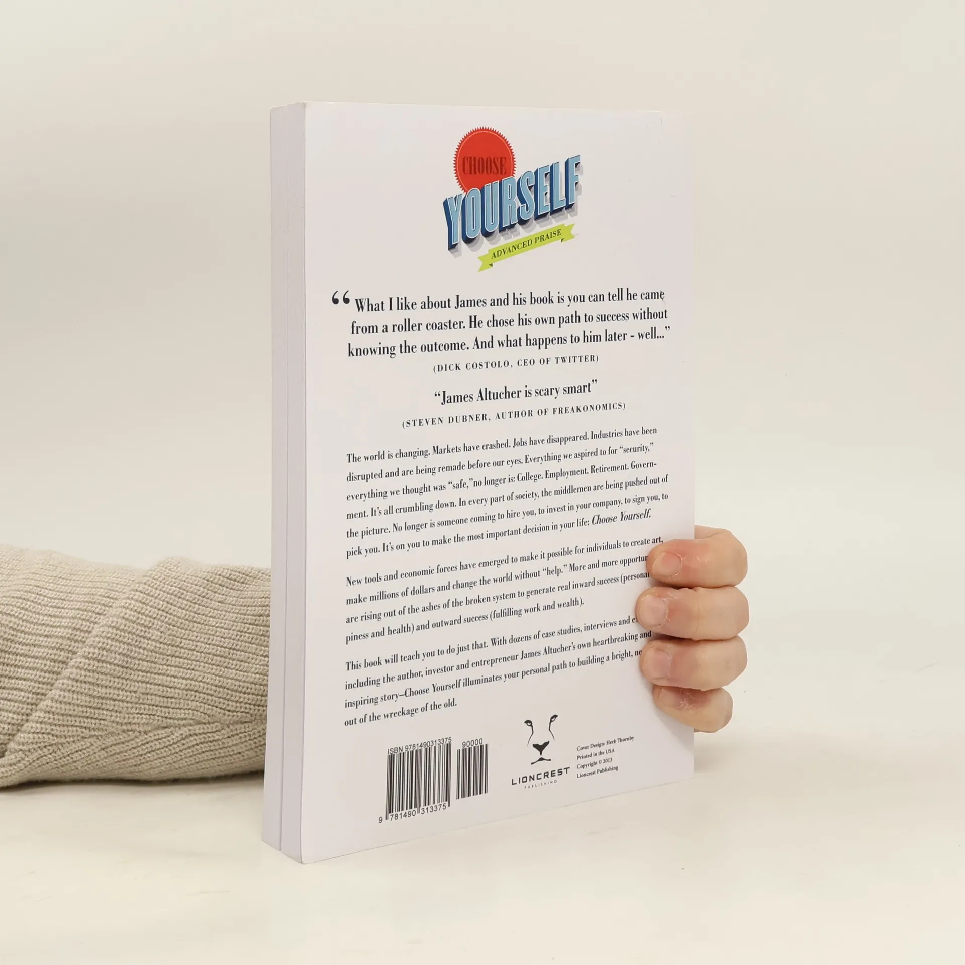 The world is changing. Markets have crashed. Jobs have disappeared. Industries have been disrupted and are being remade before our eyes. Everything we aspired to for “security,” everything we thought was “safe,” no longer is: College. Employment. Retirement. Government. It's all crumbling down. In every part of society, the middlemen are being pushed out of the picture. No longer is someone coming to hire you, to invest in your company, to sign you, to pick you. It's on you to make the most important decision in your life: Choose Yourself. New tools and economic forces have emerged to make it possible for individuals to create art, make millions of dollars and change the world without “help.” More and more opportunities are rising out of the ashes of the broken system to generate real inward success (personal happiness and health) and outward success (fulfilling work and wealth). This book will teach you to do just that. With dozens of case studies, interviews and examples–including the author, investor and entrepreneur James Altucher's own heartbreaking and inspiring story–Choose Yourself illuminates your personal path to building a bright, new world out of the wreckage of the old.