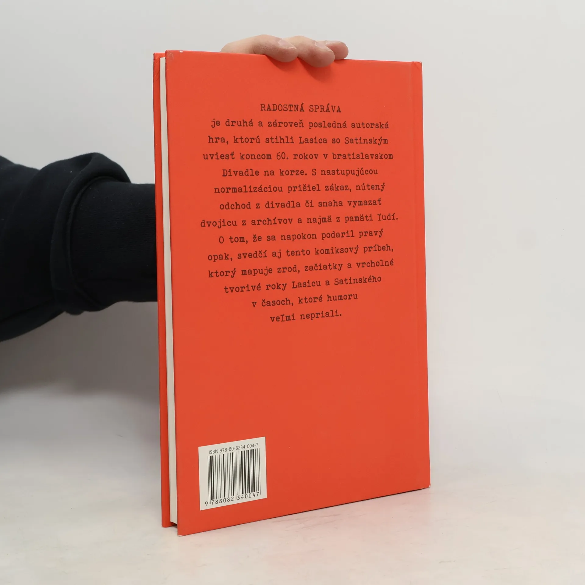 Komiksový príbeh legendárnej dvojice Radostná správa je druhá a zároveň posledná autorská hra, ktorú stihli Lasica so Satinským uviesť koncom 60. rokov v bratislavskom Divadle na korze. S nastupujúcou normalizáciou prišiel zákaz, nútený odchod z divadla či snaha vymazať dvojicu z archívov a najmä z pamäti ľudí. O tom, že sa napokon podaril pravý opak, svedčí aj tento komiksový príbeh, ktorý mapuje zrod, začiatky a vrcholné tvorivé roky Lasicu a Satinského v časoch, ktoré humoru veľmi nepriali.
