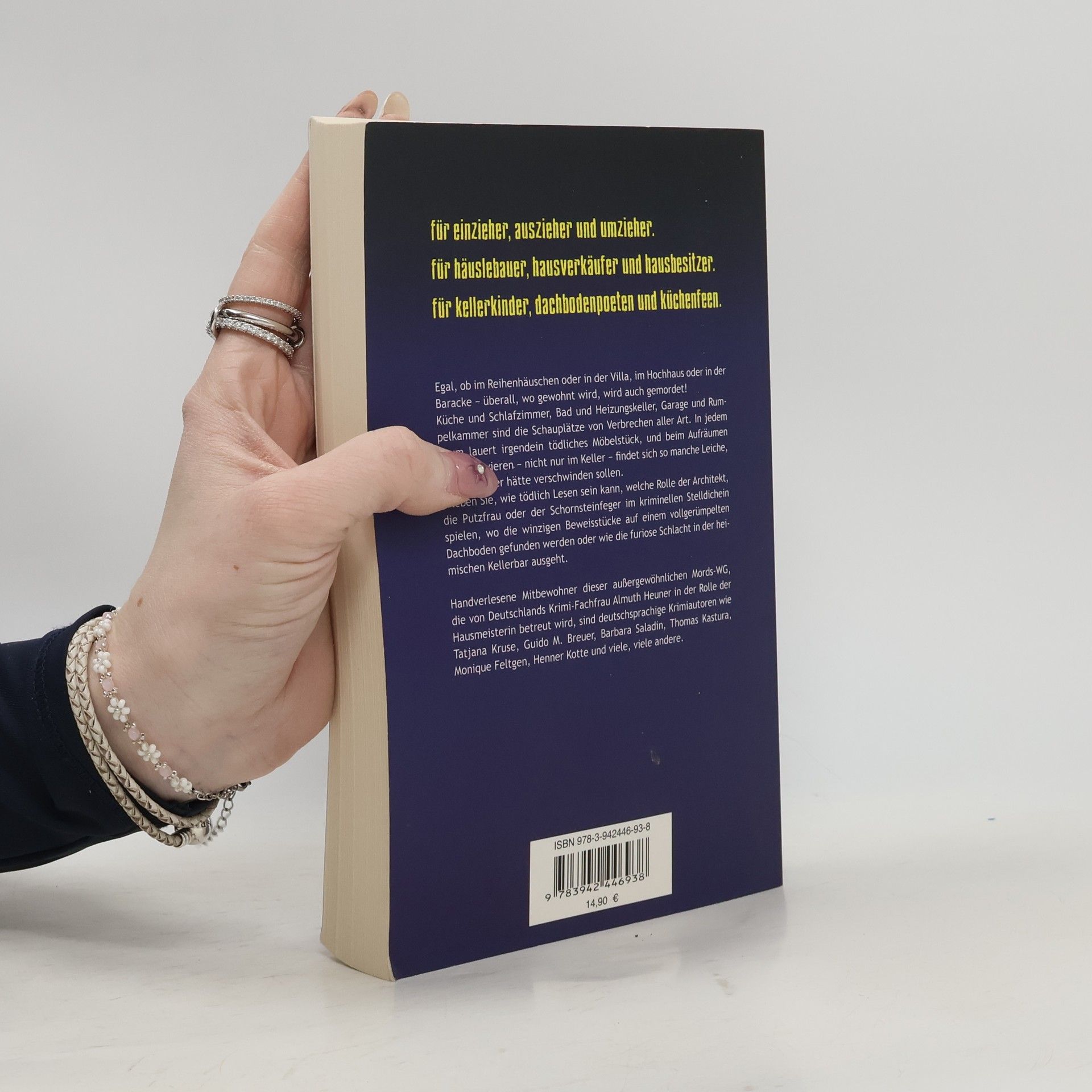 Morde unter Dach und Fach Egal, ob im Reihenhäuschen oder in der Villa, im Hochhaus oder in der Baracke – überall, wo gewohnt wird, wird auch gemordet! Küche und Schlafzimmer, Bad und Heizungskeller, Garage und Rumpelkammer sind die Schauplätze von Verbrechen aller Art. In jedem Raum lauert irgendein tödliches Möbelstück, und beim Aufräumen oder Renovieren - nicht nur im Keller - findet sich so manche Leiche, die für immer hätte verschwinden sollen. Erleben Sie, wie tödlich Lesen sein kann, welche Rolle der Architekt, die Putzfrau oder der Schornsteinfeger im kriminellen Stelldichein spielen, wo die winzigen Beweisstücke auf einem vollgerümpelten Dachboden gefunden werden oder wie die furiose Schlacht in der heimischen Kellerbar ausgeht. Handverlesene Mitbewohner dieser außergewöhnlichen Mords-WG, die von Deutschlands Krimi-Fachfrau Almuth Heuner in der Rolle der Hausmeisterin betreut wird, sind deutschsprachige Krimiautoren wie Tatjana Kruse, Guido Breuer, Barbara Saladin, Thomas Kastura, Monique Feltgen, Henner Kotte und viele, viele andere.