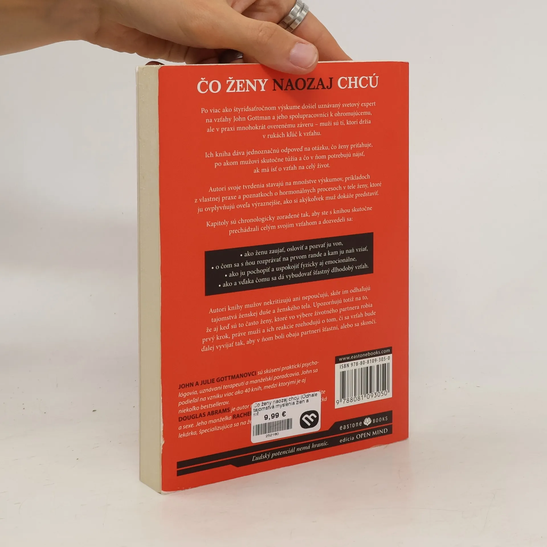 Po viac ako štyridsaťročnom výskume došiel uznávaný svetový expert na vzťahy John Gottman a jeho spolupracovníci k ohromujúcemu, ale v praxi mnohokrát overenému záveru – muži sú tí, ktorí držia v rukách kľúč k vzťahu. Autori svoje tvrdenia stavajú na množstve výskumov, príkladoch z vlastnej praxe a poznatkoch o hormonálnych procesoch v tele ženy, ktoré ju ovplyvňujú oveľa výraznejšie, ako si akýkoľvek muž dokáže predstaviť. Kapitoly sú chronologicky zoradené tak, aby ste s knihou skutočne prechádzali celým svojím vzťahom a dozvedeli sa, ako ženu zaujať, osloviť a pozvať ju von, o čom sa s ňou rozprávať na prvom rande a kam ju naň vziať, ako ju pochopiť a uspokojiť fyzicky aj emocionálne a vďaka čomu sa dá vybudovať šťastný dlhodobý vzťah.