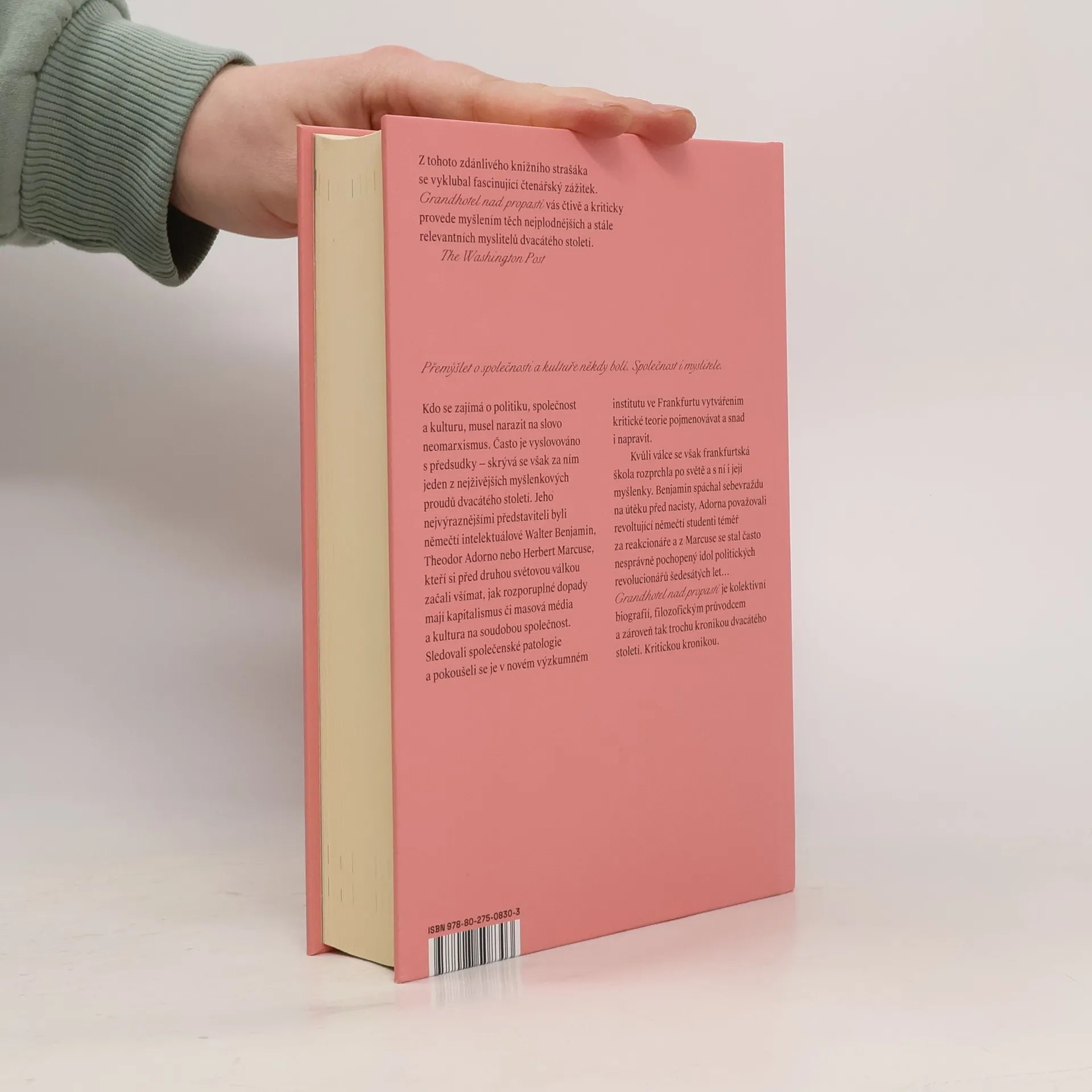 Přemýšlet o společnosti a kultuře někdy bolí. Společnost i myslitele. Pokud se někdo zajímá o politiku, společnost a kulturu, musel narazit na slovo neomarxismus. V Česku je často vyslovováno s předsudky — skrývá se však za ním jeden z nejživějších myšlenkových proudů dvacátého století. Jeho nejvýraznější představitelé byli němečtí intelektuálové jako Walter Benjamin, Theodor Adorno nebo Herbert Marcuse, kteří si před druhou světovou válkou začali všímat, jak rozporuplné dopady mají masová média a kultura na soudobou společnost. Sledovali společenské patologie a pokoušeli se je v novém výzkumném institutu ve Frankfurtu vytvářením kritické teorie pojmenovávat a snad i napravit. Po válce se však Frankfurtská škola rozprchla po světě a s ní i její myšlenky. Benjamin spáchal sebevraždu na útěku před nacisty, Adorno se marně pokoušel o kariéru v Kalifornii, z Marcuseho se stal idol hippies… Grandhotel nad propastí je kolektivní biografií, průvodcem neomarxistickou filozofií a zároveň tak trochu kronikou dvacátého století. Kritickou kronikou.