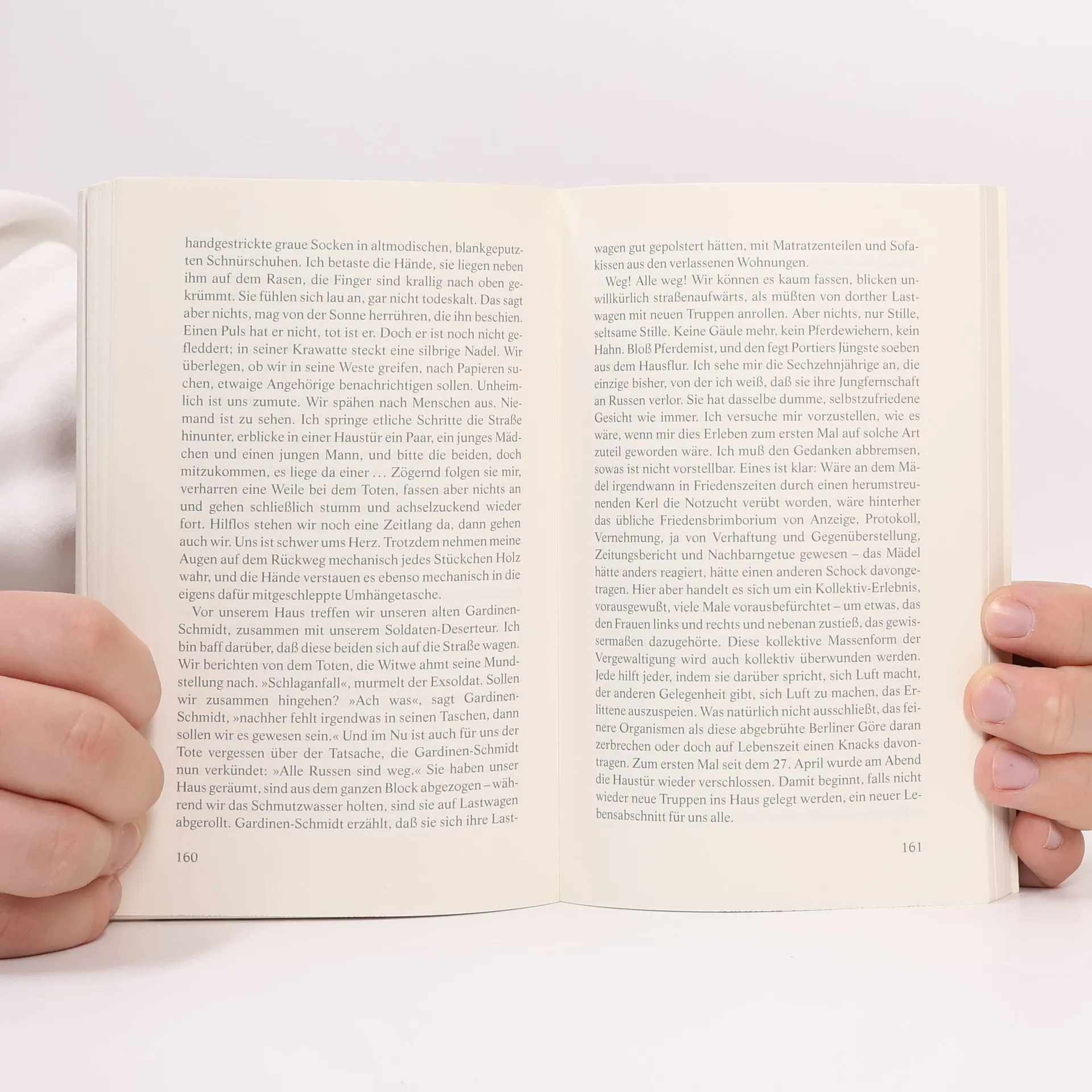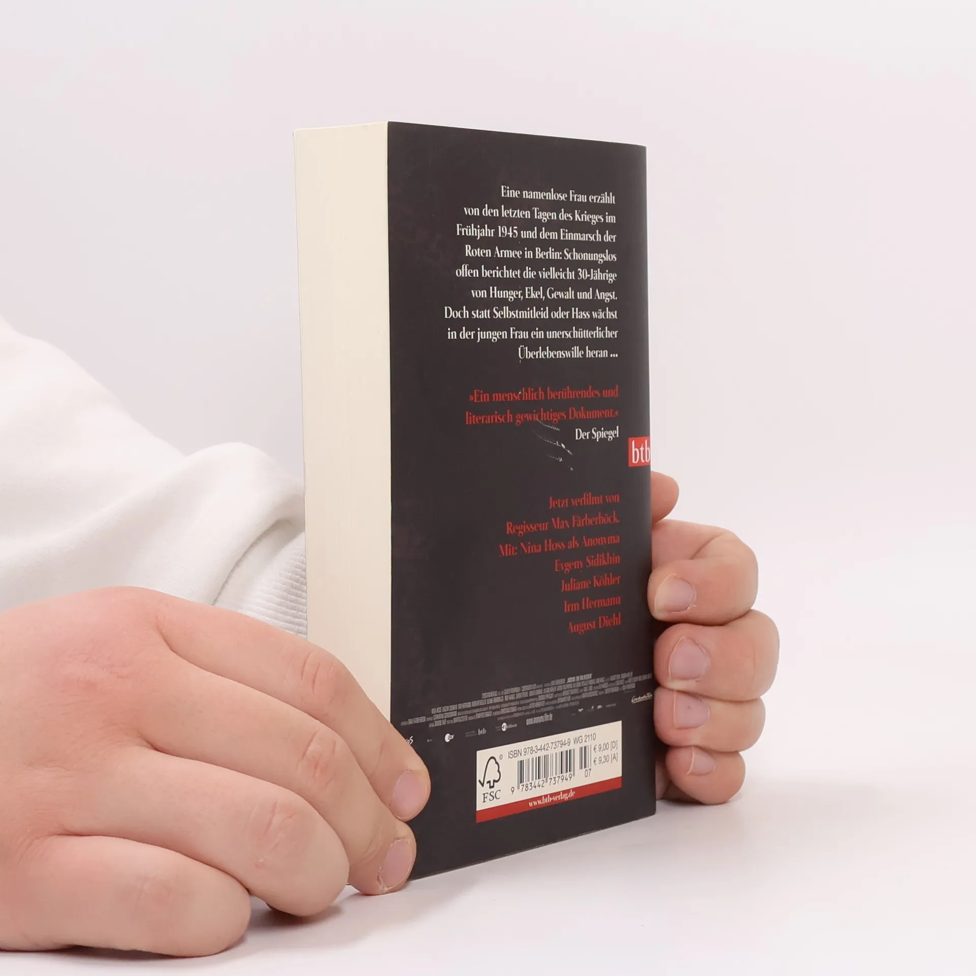 Die erschütternden Aufzeichnungen einer jungen Frau über die letzten Tage des Zweiten Weltkriegs in Berlin Eine namenlose Frau erzählt von den letzten Tagen des Krieges im Frühjahr 1945 und dem Einmarsch der Roten Armee in Berlin: Schonungslos offen und mit einem feinsinnigen Gespür für diese beispiellose Zeit berichtet die vielleicht 30-Jährige von Hunger, Ekel, Gewalt und Angst. Drei Schulhefte sind ihr geblieben, in die sie nun notiert, was ihr während des Tages und der Nacht widerfährt, und statt Selbstmitleid oder Hass wächst in der jungen Frau ein unerschütterlicher Überlebenswille heran. Das Filmereignis im Oktober 2008 - die Titelrolle spielt Nina Hoss, ihr Mann Gerd wird von August Diehl dargestellt. In weiteren Rollen spielen Sandra Hüller, Juliane Köhler und Jördis Triebel.