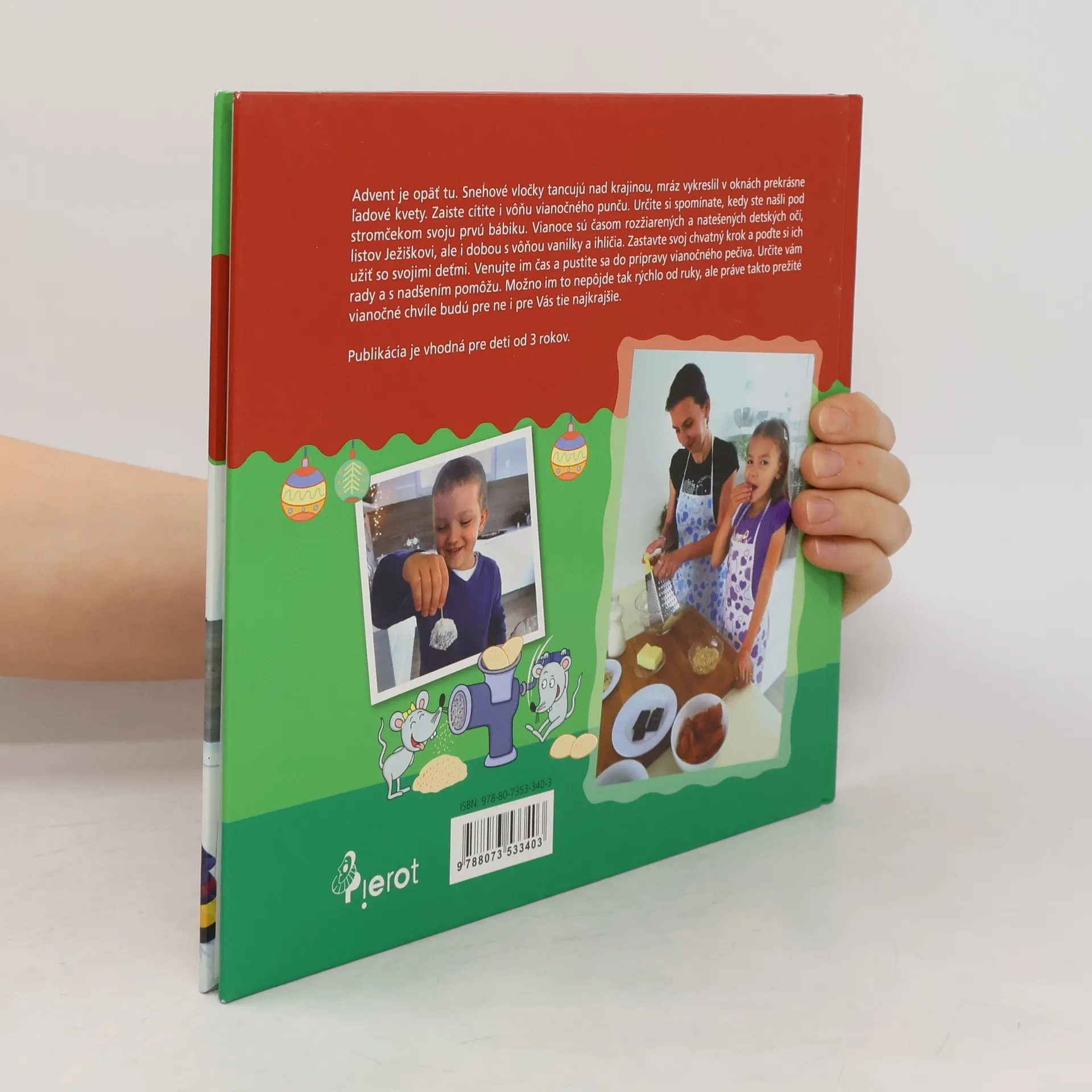 Advent je opäť tu. Snehové vločky tancujú nad krajinou, mráz vykreslil v oknách prekrásne ľadové kvety. Dozaista cítite i vôňu vianočného punču. Určite si spomínate, kedy ste našli pod stromčekom svoju prvú bábiku. Vianoce sú časom rozžiarených a natešených detských očí, listov Ježiškovi, ale aj dobou s vôňou vanilky a ihličia. Zastavte svoj chvatný krok a poďte si ich užiť so svojimi deťmi. Venujte im čas a pustite sa do prípravy vianočného pečiva. Určite vám rady a s nadšením pomôžu. Možno im to nepôjde tak rýchlo od ruky, ale práve takto prežité vianočné chvíle budú pre ne i pre vás tie najkrajšie. Publikácia je vhodná pre deti od 3 rokov.