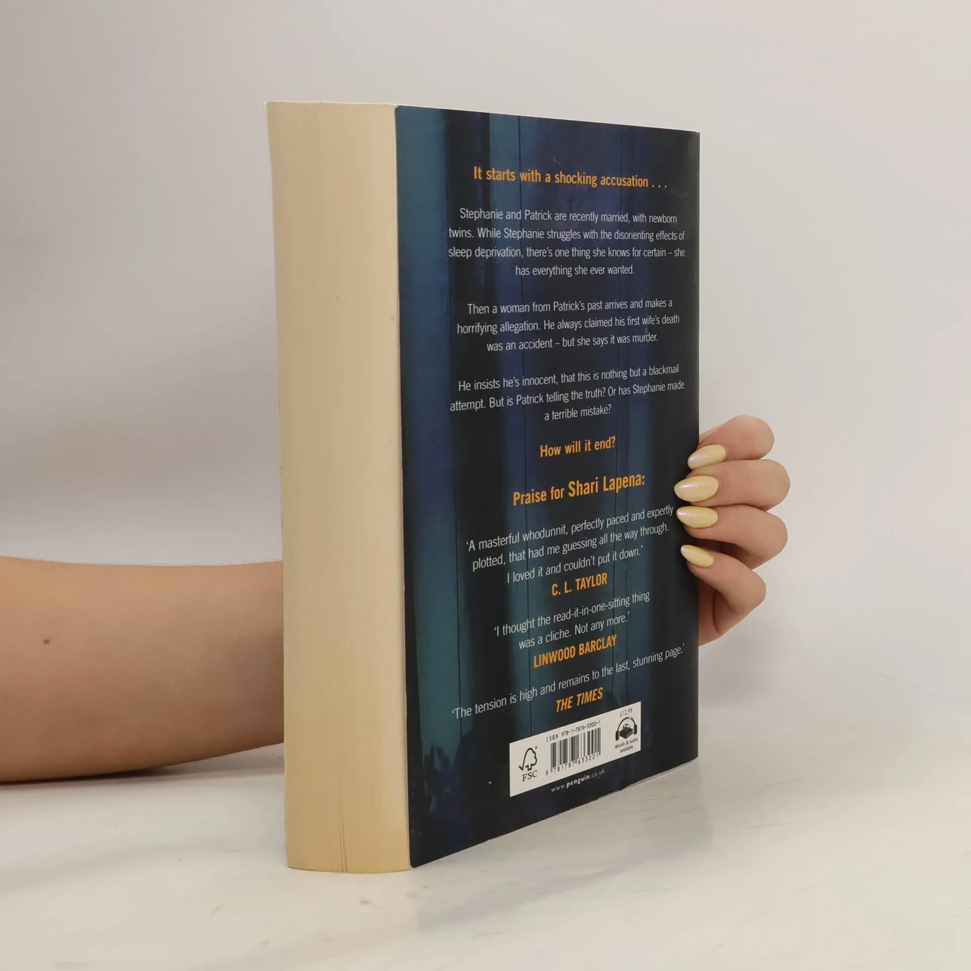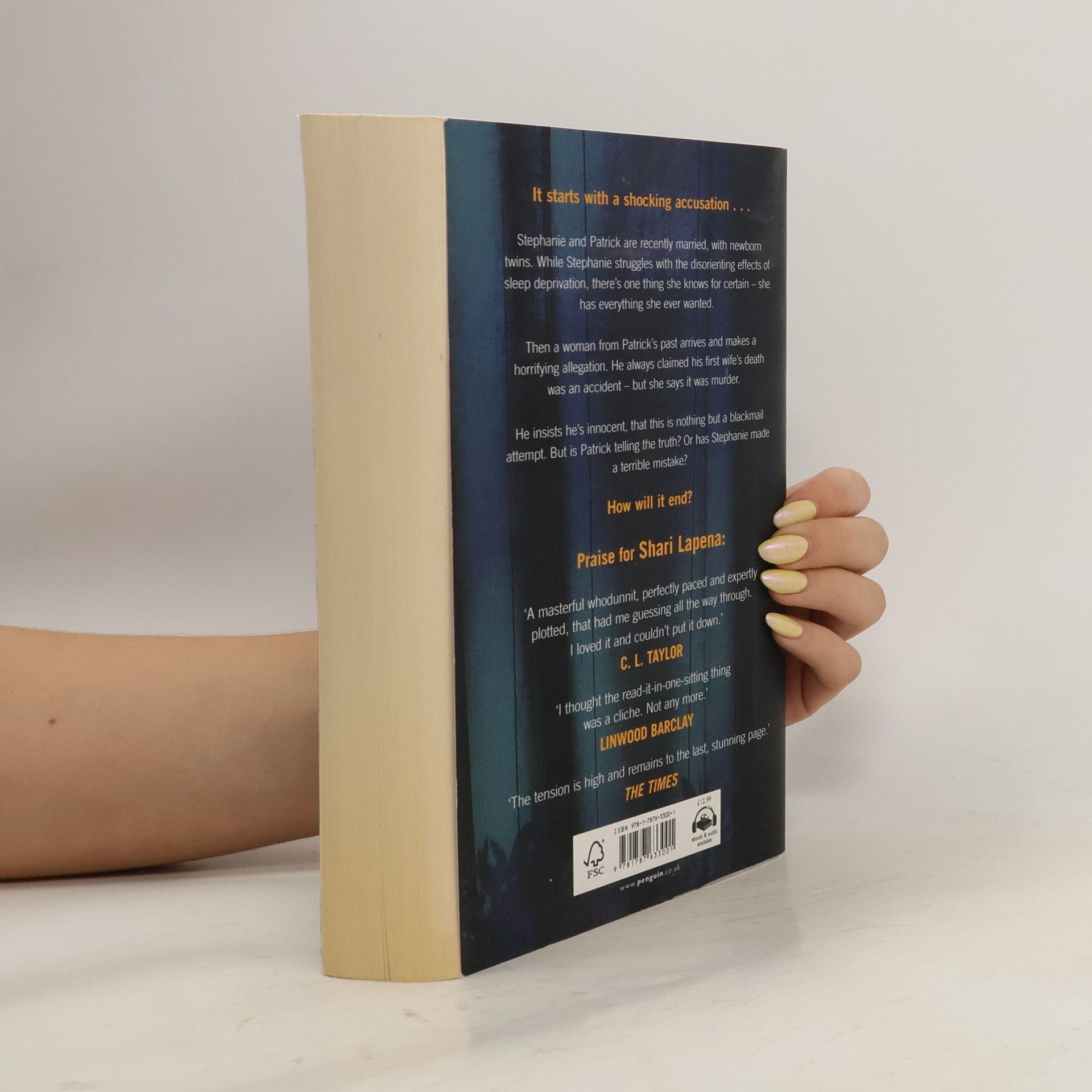 The latest unputdownable thriller from Shari Lapena, the No. 1 Sunday Times bestselling author of THE COUPLE NEXT DOOR and SOMEONE WE KNOW. It starts with a shocking accusation . . .Stephanie and Patrick are recently married, with new-born twins. While Stephanie struggles with the disorienting effects of sleep deprivation, there's one thing she knows for certain - she has everything she ever wanted. Then a woman from his past arrives and makes a horrifying allegation about his first wife. He always claimed her death was an accident - but she says it was murder. He insists he's innocent, that this is nothing but a blackmail attempt. But is Patrick telling the truth? Or has Stephanie made a terrible mistake?How will it end?