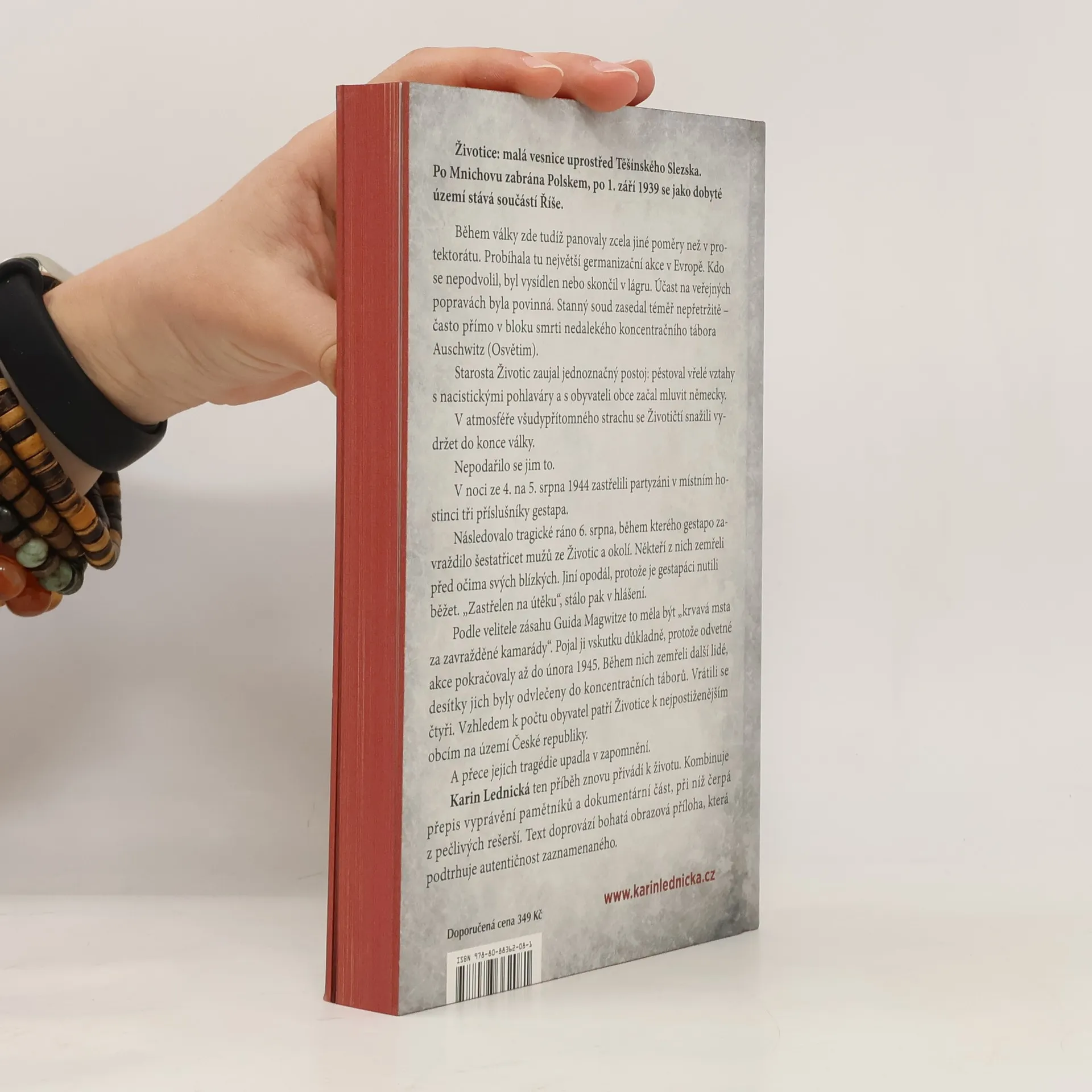 Životice: malá vesnice uprostřed Těšínského Slezska. Po Mnichovu zabrána Polskem, po 1. září 1939 se jako dobyté území stává součástí Říše. Během války zde tudíž panovaly zcela jiné poměry než v protektorátu. Probíhala tu největší germanizační akce v Evropě. Kdo se nepodvolil, byl vysídlen nebo skončil v lágru. Účast na veřejných popravách byla povinná. Stanný soud zasedal téměř nepřetržitě – často přímo v bloku smrti nedalekého koncentračního tábora Auschwitz (Osvětim). Starosta Životic zaujal jednoznačný postoj: pěstoval vřelé vztahy s nacistickými pohlaváry a s obyvateli obce začal mluvit německy. V atmosféře všudypřítomného strachu se Životičtí snažili vydržet do konce války. Nepodařilo se jim to. Karin Lednická ten příběh znovu přivádí k životu. Kombinuje přepis vyprávění pamětníků a dokumentární část, při níž čerpá z pečlivých rešerší. Text doprovází bohatá obrazová příloha, která podtrhuje autentičnost zaznamenaného.