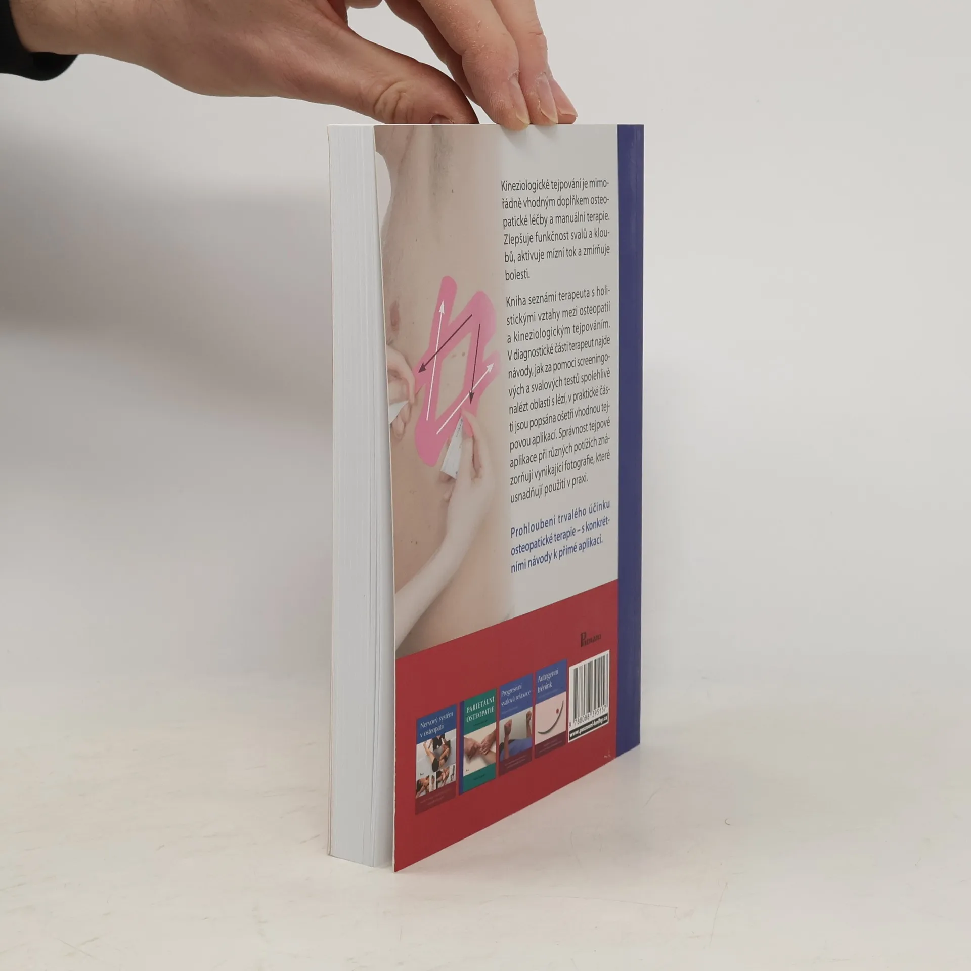 Kineziologické tejpování je mimořádně vhodným doplňkem osteopatické léčby a manuální terapie. Zlepšuje funkčnost svalů a kloubů, aktivuje mízní tok a zmírňuje bolesti. Kniha seznámí terapeuta s holistickými vztahy mezi osteopatií a kineziologickým tejpováním. V diagnostické části terapeut najde návody, jak za pomoci screeningových a svalových testů spolehlivě nalézt oblasti s lézí, v praktické části jsou popsána ošetření vhodnou tejpovou aplikací. Správnost tejpové aplikace při různých potížích znázorňují vynikající fotografie, které usnadňují použití v praxi. Prohloubení trvalého účinku osteopatické terapie – s konkrétními návody k přímé aplikaci.