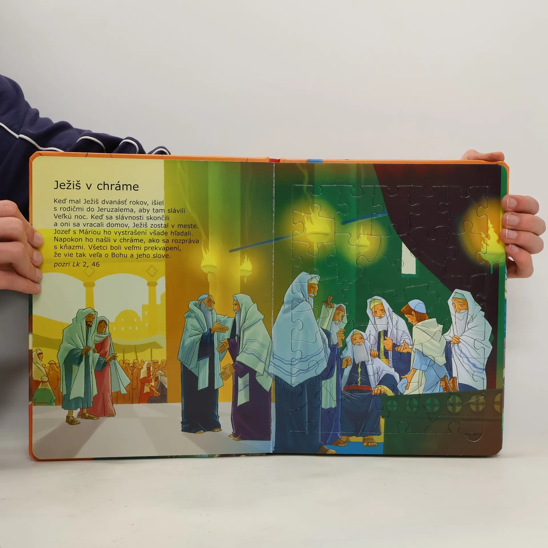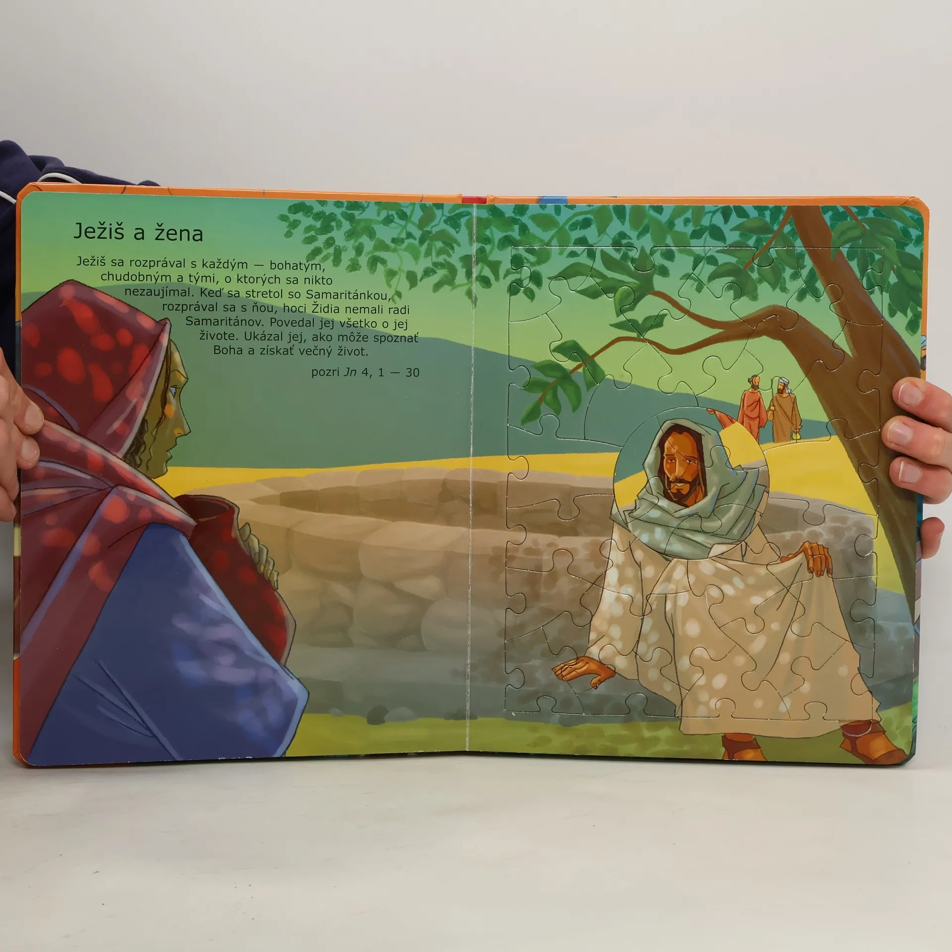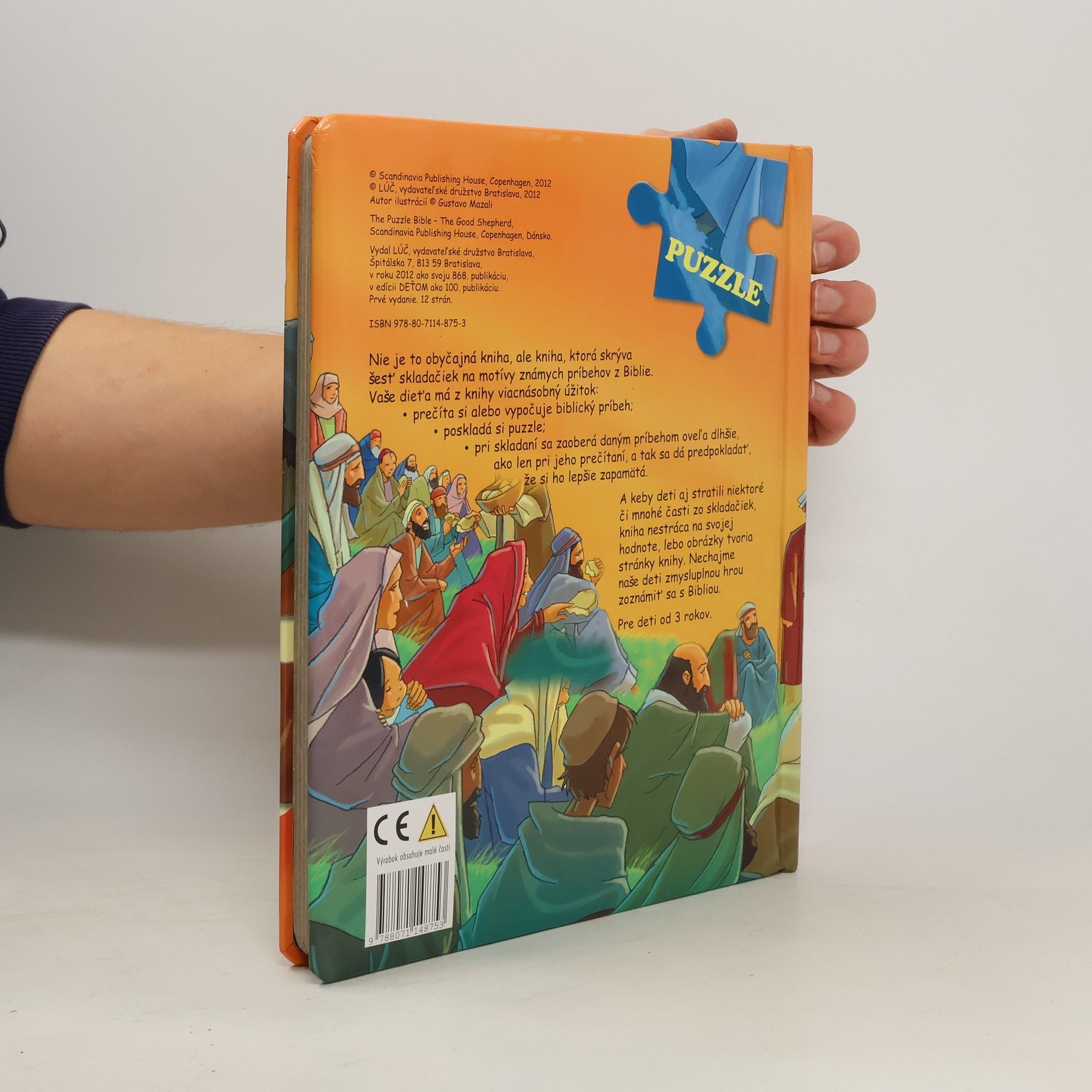 Nie je to obyčajná kniha, ale kniha, ktorá skrýva šesť skladačiek na motívy známych príbehov z Biblie. Vaše dieťa má z knihy viacnásobný úžitok: - prečíta si alebo vypočuje biblický príbeh; - poskladá si puzzle; - pri skladaní sa zaoberá daným príbehom oveľa dlhšie, ako len pri jeho prečítaní, a tak sa dá predpokladať, že si ho lepšie zapamätá. Pre deti od 3 rokov.