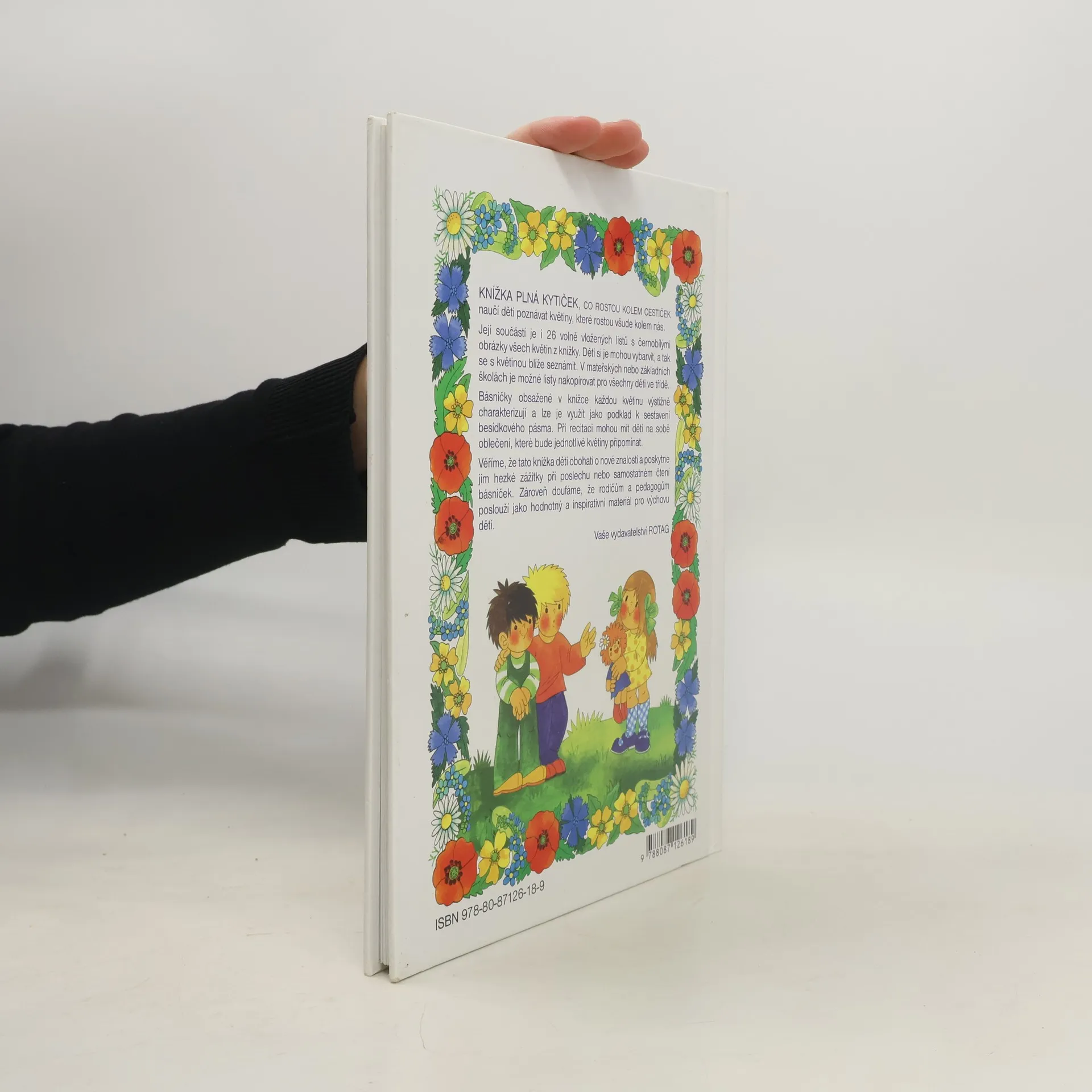 KNÍŽKA PLNÁ KYTIČEK, co rostou kolem cestiček naučí děti poznávat květiny, které rostou všude kolem nás. Obsahuje 26 nejznámějších kytiček, které tvoří vždy s příslušnou básničkou dvojstránku v knížce. Součástí knížky jsou i černobílé obrázky všech květin na volných listech, vložených do nalepených kapes na přední i zadní straně vnitřní obálky. Děti si je mohou vybarvit a tak se blíže s květinou seznámit. V mateřských nebo základních školách je možné listy nakopírovat pro všechny děti ve třídě.