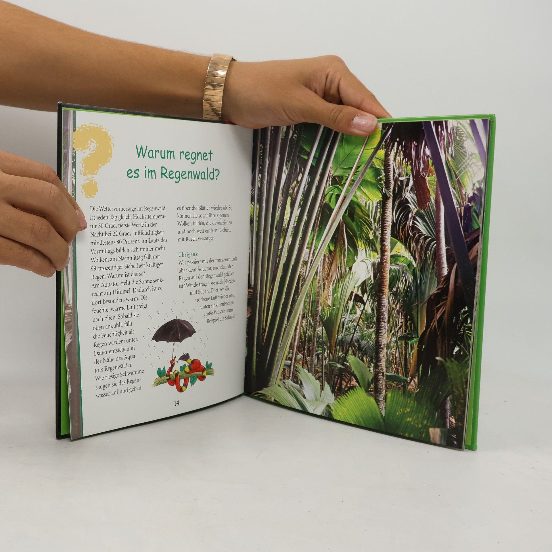 Warum gibt es im Regenwald keinen Heuschnupfen? Warum stehen Bäume auf Stelzen? Was hat die Sahara mit dem Regenwald zu tun? Warum ist das Faultier faul? Können Schlangen fliegen? Welche Pflanzen reiten huckepack? Was sind Nebelwälder? …Und viele Fragen mehr rund um den Regenwald.