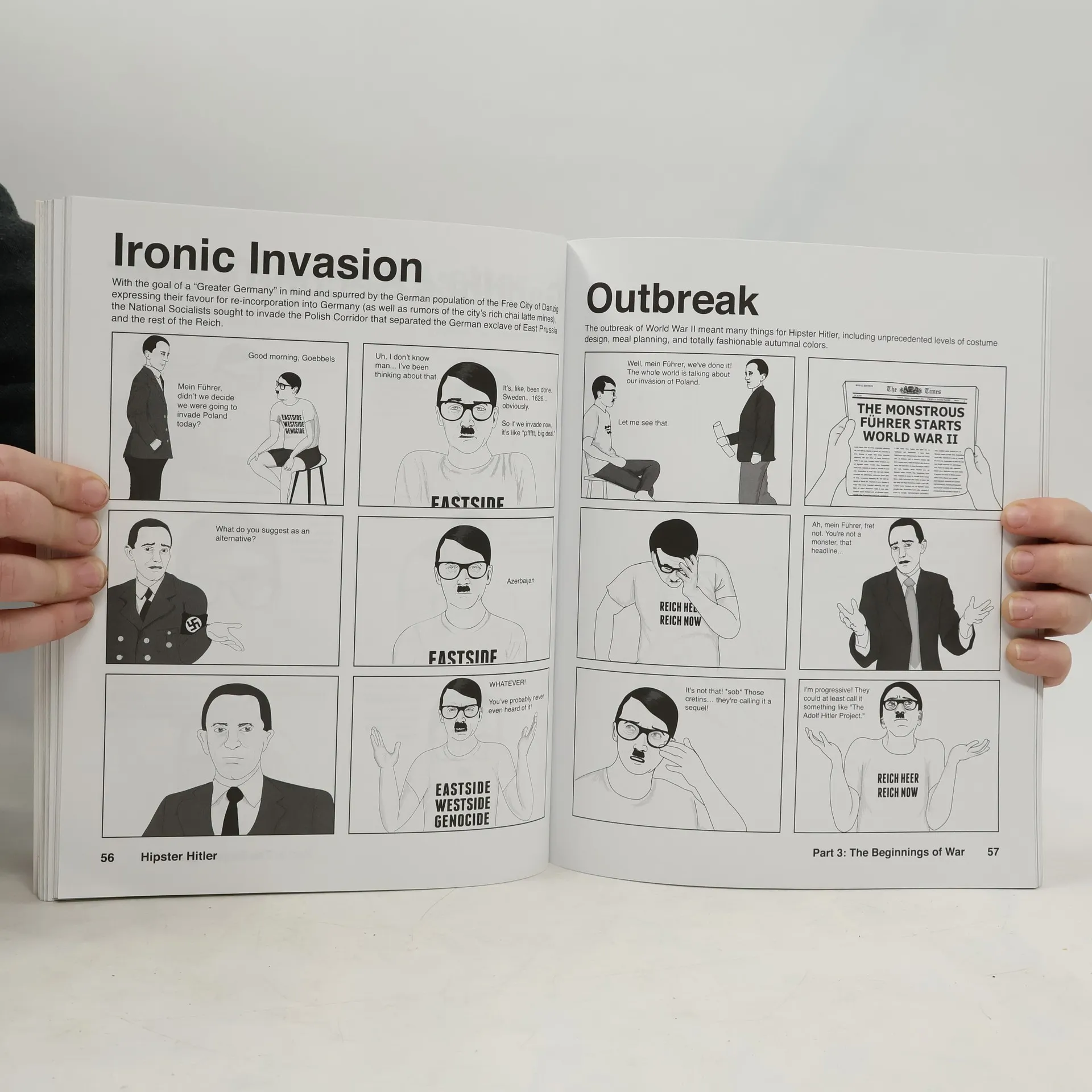 Satirizes hipster culture and the exploits of the Third Reich using a combination puns, parody, dark humor, and visual gags.