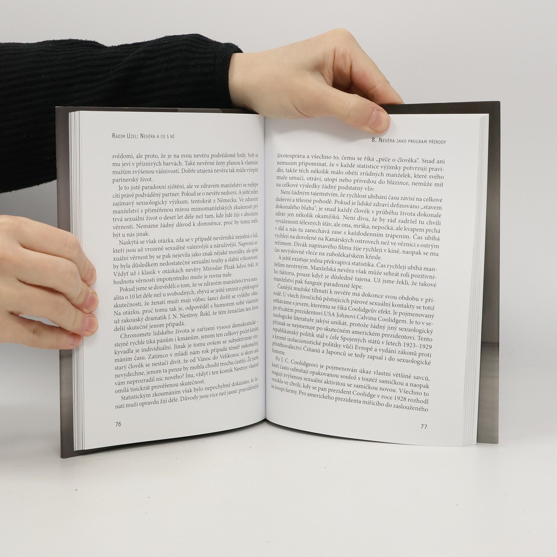 … lásku jsme si přísahali, slovo jsme si navždy dali, v každé době věrni zůstaneme sobě… Snad. Stát se to může. I když nějaký škarohlíd by jistě mohl namítnout, že věrné a neutuchající milování Jeníka a Mařenky je spíše ojedinělým jevem balancujícím na vratké hranici statistické chyby. Říká se, že muži (Jeník promine) jsou prý již od přírody rodem polygamním, přelétavým, mravně nepevným a permanentně toužícím po cizích ložích, kdežto věrné a sexuálně zdrženlivé Mařenky s rukama v klíně tiše drží sošnou stráž u rodinného krbu, ve výše uvedeném případě u selské pece. Nu, jak která. Aniž bychom tím však chtěli skládat úlitbu věhlasným genderovým studiím, konstatujme, že skutečnost je daleko složitější. Doktor Radim Uzel, náš přední sexuolog, zúročil v této knize zkušenosti ze své mnohaleté poradenské praxe. Píše o nich poučeně, lehce a s odpouštějícím nadhledem. Vždyť nevěra má nejméně tolik podob jako láska. Fotografie Jan Uzel