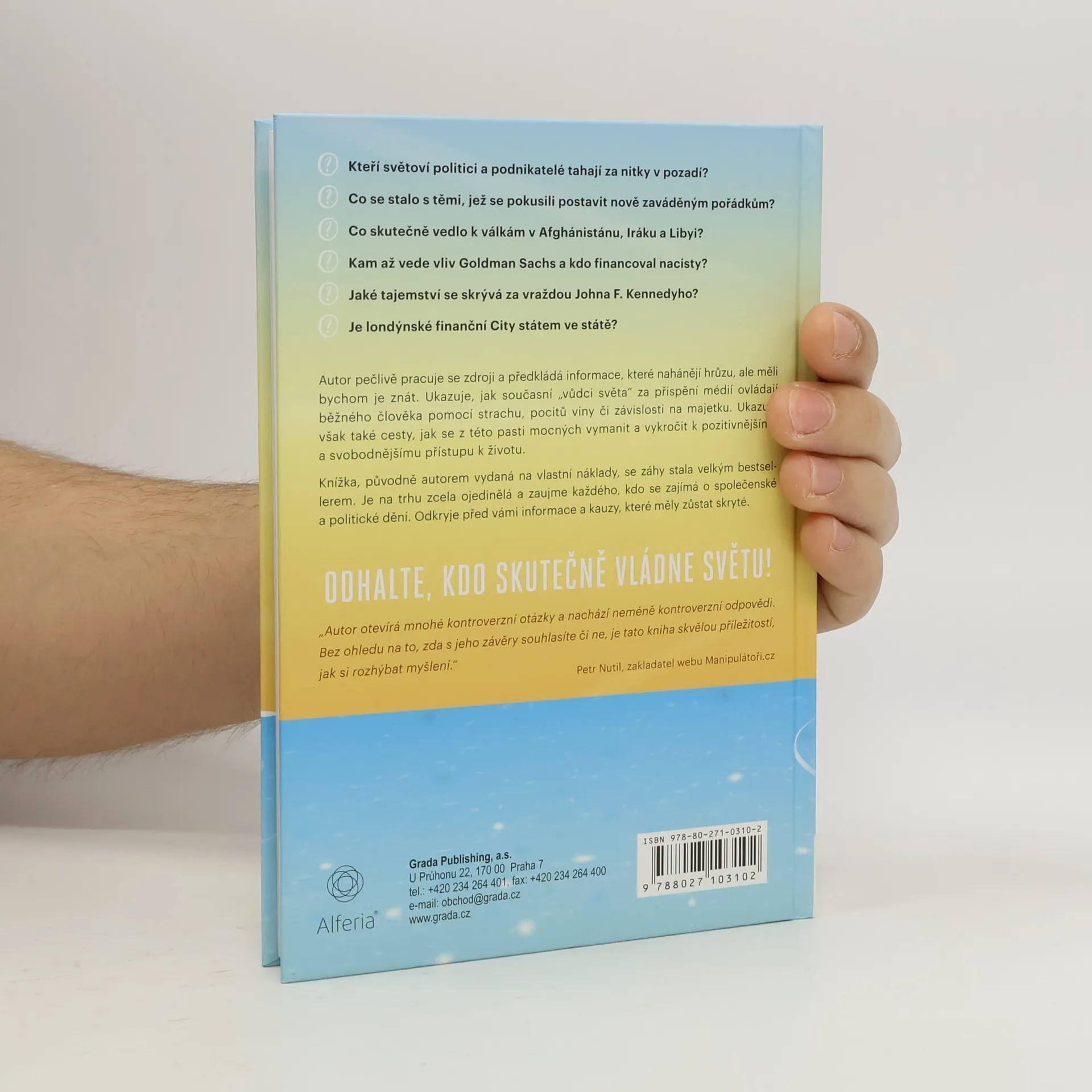 - Kteří světoví politici a podnikatelé tahají za nitky v pozadí? - Co se stalo s těmi, jež se pokusili postavit nově zaváděným pořádkům? - Co skutečně vedlo k válkám v Afghánistánu, Iráku a Libyi? - Kam až vede vliv Goldman Sachs a kdo financoval nacisty? - Jaké tajemství se skrývá za vraždou Johna F. Kennedyho? - Je londýnské finanční City státem ve státě? Autor pečlivě pracuje se zdroji a předkládá informace, které nahánějí hrůzu, ale měli bychom je znát. Ukazuje, jak současní „vůdci světa“ za přispění médií ovládají běžného člověka pomocí strachu, pocitů viny či závislosti na majetku. Ukazuje však také cesty, jak se z této pasti mocných vymanit a vykročit k pozitivnějšímu a svobodnějšímu přístupu k životu. Knížka, původně autorem vydaná na vlastní náklady, se záhy stala velkým bestsellerem. Je na trhu zcela ojedinělá a zaujme každého, kdo se zajímavá o společenské a politické dění. Odkryje před vámi informace a kauzy, které měly zůstat skryté.