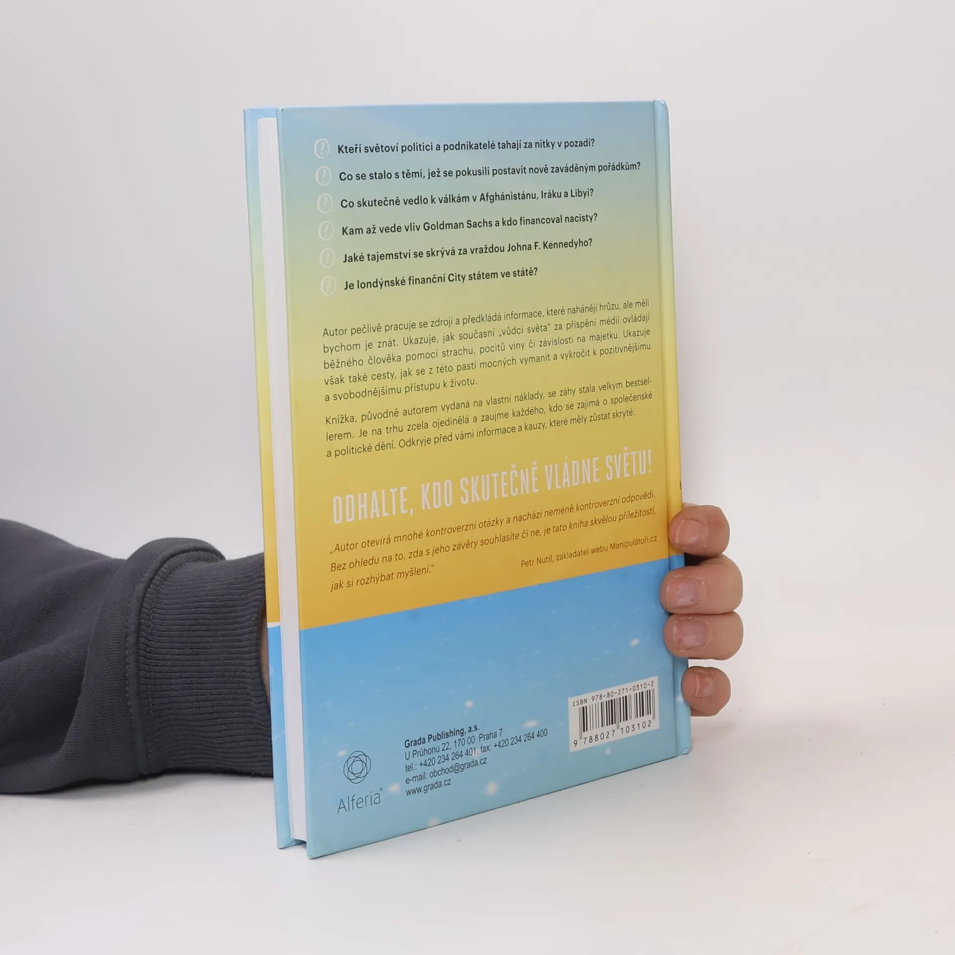 - Kteří světoví politici a podnikatelé tahají za nitky v pozadí? - Co se stalo s těmi, jež se pokusili postavit nově zaváděným pořádkům? - Co skutečně vedlo k válkám v Afghánistánu, Iráku a Libyi? - Kam až vede vliv Goldman Sachs a kdo financoval nacisty? - Jaké tajemství se skrývá za vraždou Johna F. Kennedyho? - Je londýnské finanční City státem ve státě? Autor pečlivě pracuje se zdroji a předkládá informace, které nahánějí hrůzu, ale měli bychom je znát. Ukazuje, jak současní „vůdci světa“ za přispění médií ovládají běžného člověka pomocí strachu, pocitů viny či závislosti na majetku. Ukazuje však také cesty, jak se z této pasti mocných vymanit a vykročit k pozitivnějšímu a svobodnějšímu přístupu k životu. Knížka, původně autorem vydaná na vlastní náklady, se záhy stala velkým bestsellerem. Je na trhu zcela ojedinělá a zaujme každého, kdo se zajímavá o společenské a politické dění. Odkryje před vámi informace a kauzy, které měly zůstat skryté.