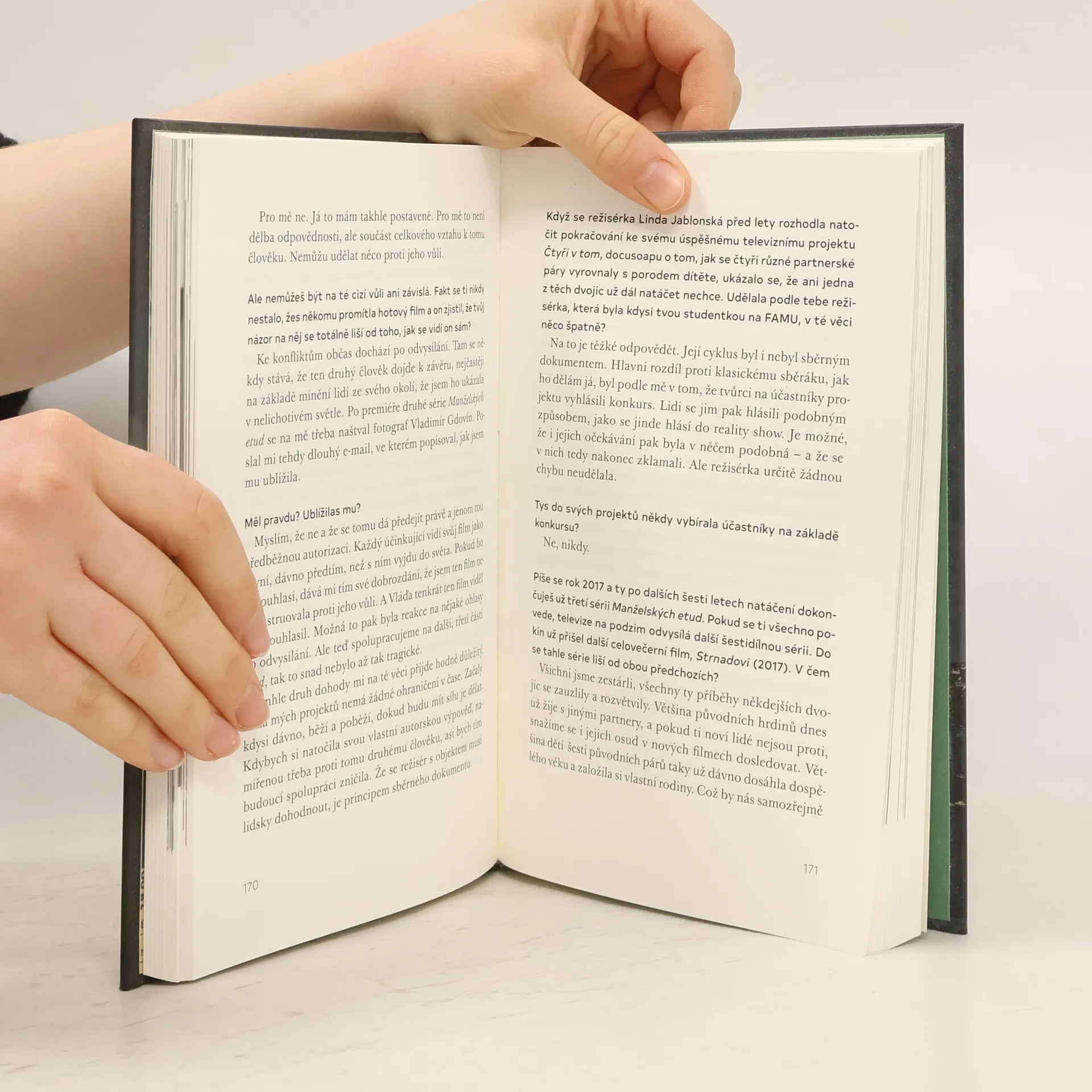 Helena Třeštíková v rozhovoru s Pavlem Kosatíkem. „Když člověk bydlí na Václaváku, nemůže si představovat, že unikne dějinám,“ říká dokumentaristka Helena Třeštíková, která se narodila přímo v jednom z domů na slavném pražském náměstí. Moderní československé a posléze české dějiny zachytila jako nikdo jiný, místo politiků a velkých událostí sledovala v Manželských etudách obyčejné rodiny. Díky unikátní technice sběrného dokumentu, kterou někdo nazývá také posedlostí uplývajícím časem, zpřítomnila proměnu společenských poměrů i způsobu života jednotlivců. Nyní si sama vyzkoušela jaké to je stát se objektem, známý spisovatel Pavel Kosatík přináší nejucelenější pohled na život Heleny Třeštíkové od jejího dětství do současnosti. Režisérka vypráví o vlastní rodině i účinkujících, kteří se často stávají jejími pomyslnými členy. Natož když se protagonista do režisérky zamiluje. Odhaluje zrození filmového stylu, vzpomíná na svoje vzory i na to, jak se sběrný dokument za čtyřicet let proměnil. Nechybí ani otázky související s etikou jejího přístupu, okolnostmi vzniku nejvýznamnějších filmů i jejího působení v politice, které sama považuje za svůj největší omyl. I tyto otázky mohou být překvapivě osobní.