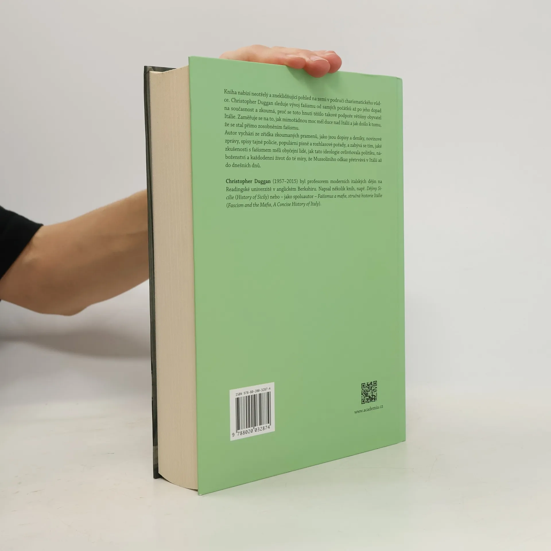 Kniha nabízí neotřelý a zneklidňující pohled na zemi v područí charismatického vůdce. Christopher Duggan sleduje vývoj fašismu od samých počátků až po jeho dopad na současnost a zkoumá, proč se toto hnutí těšilo takové podpoře většiny obyvatel Itálie. Zaměřuje se na to, jak mimořádnou moc měl duce nad Itálií a jak došlo k tomu, že se stal přímo zosobněním fašismu. Autor vychází ze zřídka zkoumaných pramenů, jako jsou dopisy a deníky, novinové zprávy, spisy tajné policie, populární písně a rozhlasové pořady, a zabývá se tím, jaké zkušenosti s fašismem měli obyčejní lidé, jak tato ideologie ovlivňovala politiku, náboženství a každodenní život do té míry, že Mussoliniho odkaz přetrvává v Itálii až do dnešních dnů.