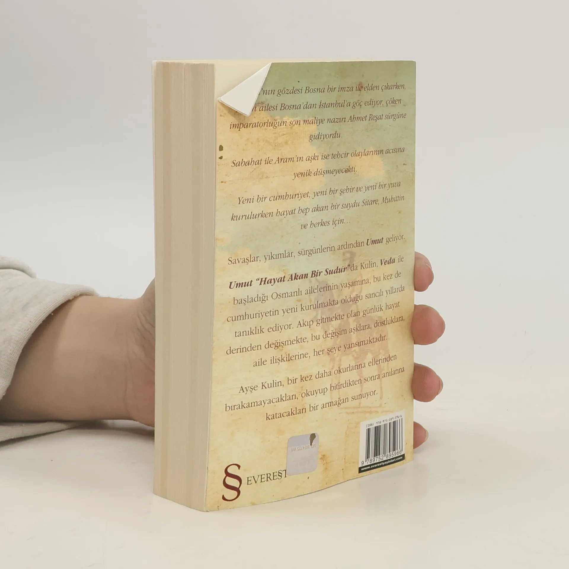 Osmanli’nin gozdesi Bosna bir imza ile elden cikarken, Kulin ailesi Bosna'dan Istanbul'a goc ediyor, coken imparatorlugun son maliye naziri Ahmet Resat surgune gidiyordu. Sabahat ile Aram'in aski ise tehcir olaylarinin acisina yenik dusmeyecekti. Yeni bir cumhuriyet, yeni bir sehir ve yeni bir yuva kurulurken hayat hep akan bir suydu Sitare, Muhittin ve herkes icin... Savaslar, yikimlar, surgunlerin ardindan Umut geliyor. Umut 'Hayat Akan Bir Sudur'da Kulin, Veda ile basladigi Osmanli ailelerinin yasamina, bu kez de Cumhuriyetin yeni kurulmakta oldugu sancili yillarda taniklik ediyor. Akip gitmekte olan gunluk hayat derinden degismekte, bu degisim asklara, dostluklara, aile iliskilerine, her seye yansimaktadir. Ayse Kulin, bir kez daha okurlarina ellerinden birakamayacaklari, okuyup bitirdikten sonra anilarina katacaklari bir armagan sunuyor.