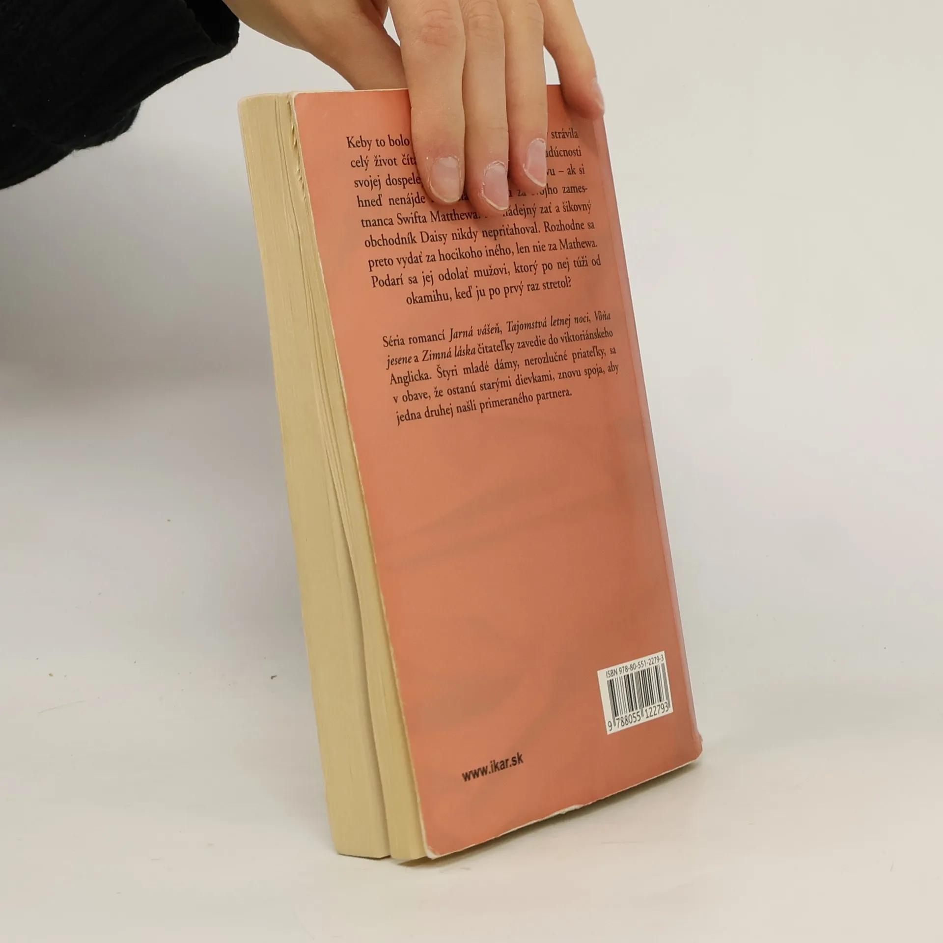Keby to bolo možné, Daisy Bowmanová by strávila celý život čítaním. Jej otec má však o budúcnosti svojej dospelej dcéry celkom inú predstavu – ak si ihneď nenájde manžela, vydá ju za svojho zamestnanca Swifta Matthewa. No nádejný zať a šikovný obchodník Daisy nikdy nepriťahoval. Rozhodne sa preto vydať za hocikoho iného, len nie za Mathewa. Podarí sa jej odolať mužovi, ktorý po nej túži od okamihu, keď ju po prvý raz stretol? Voľné pokračovanie romancí Tajomstvá letnej noci, Vôňa jesene a Zimná láska čitateľky zavedie do viktoriánskeho Anglicka. Štyri mladé dámy, nerozlučné priateľky, sa v obave, že ostanú starými dievkami, znovu spoja, aby jedna druhej našli primeraného partnera.