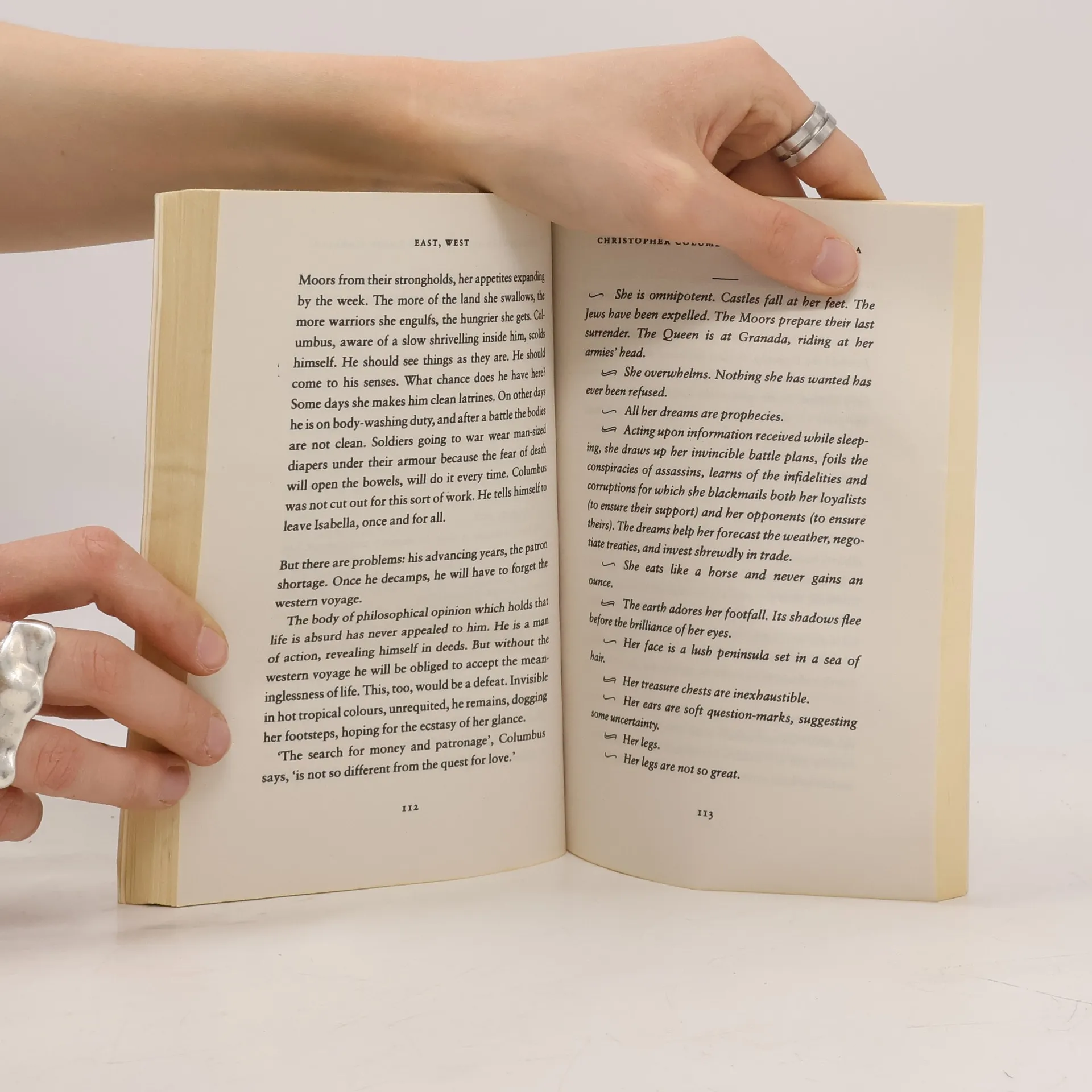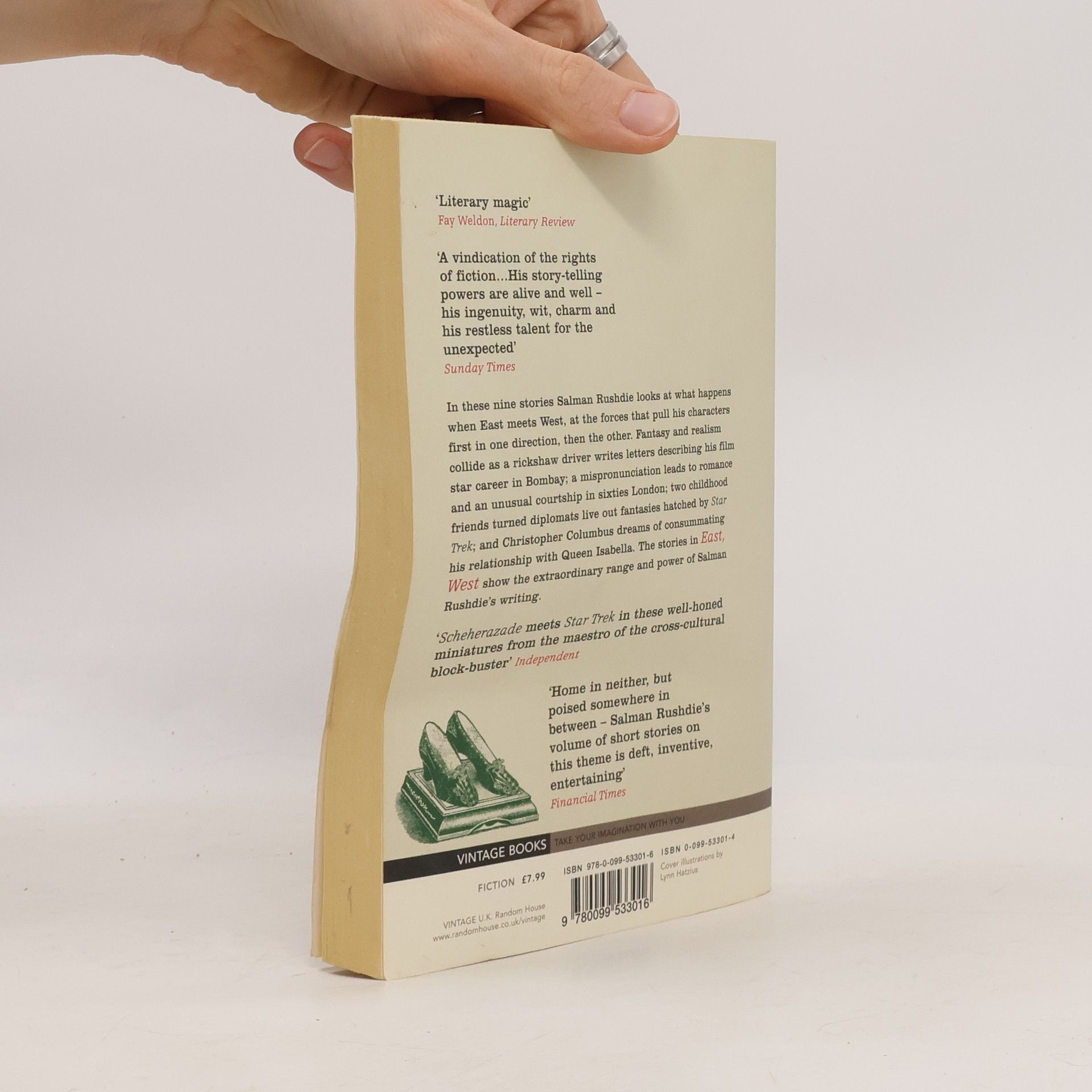 In these nine stories, Salman Rushdie looks at what happens when East meets West, at the forces that pull his characters first in one direction, then the other. Fantasy and realism collide as a rickshaw driver writes letters describing his film star career in Bombay; a mispronunciation leads to romance and an unusual courtship in sixties London; two childhood friends turned diplomats live out in a violent world fantasies hatched by "Star Trek"; and Christopher Columbus dreams of consummating his relationship with Queen Isabella. The stories in "East, West" show the extraordinary range and power of Salman Rushdie's writing.